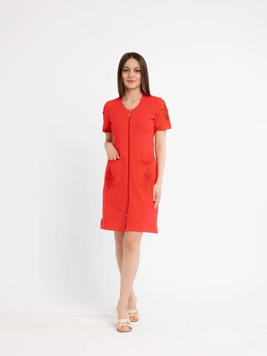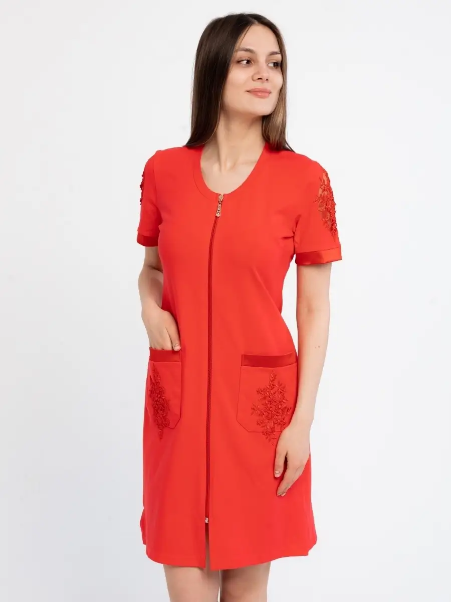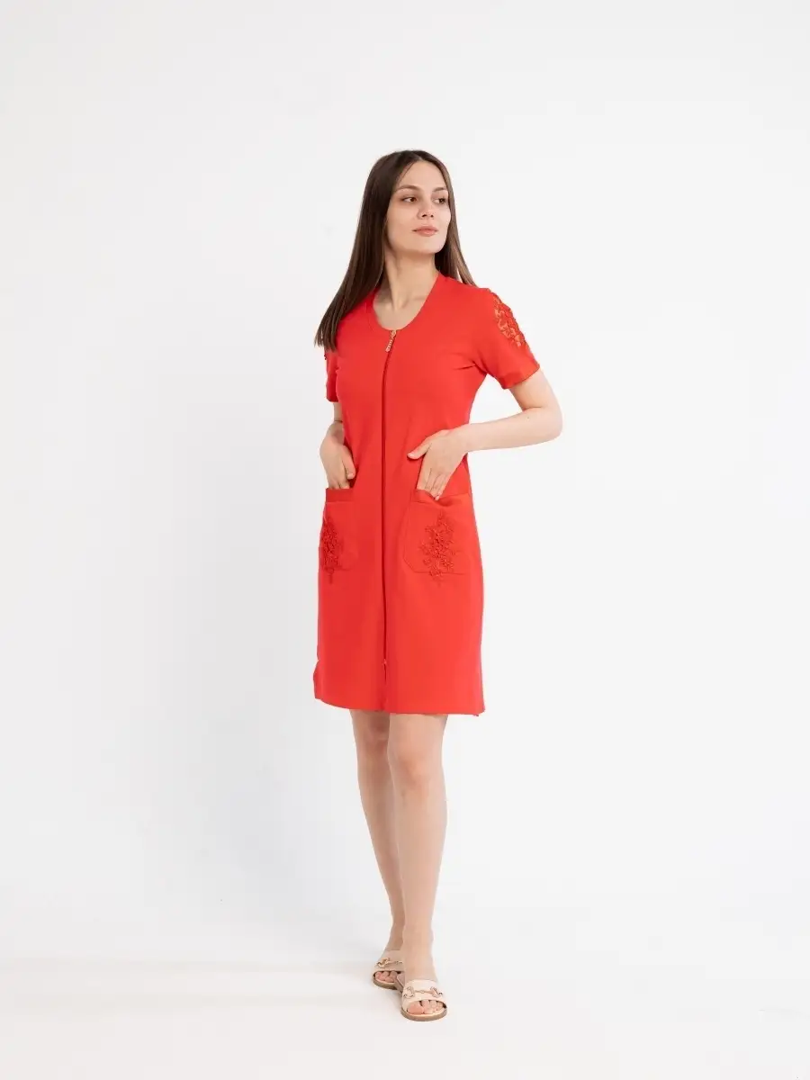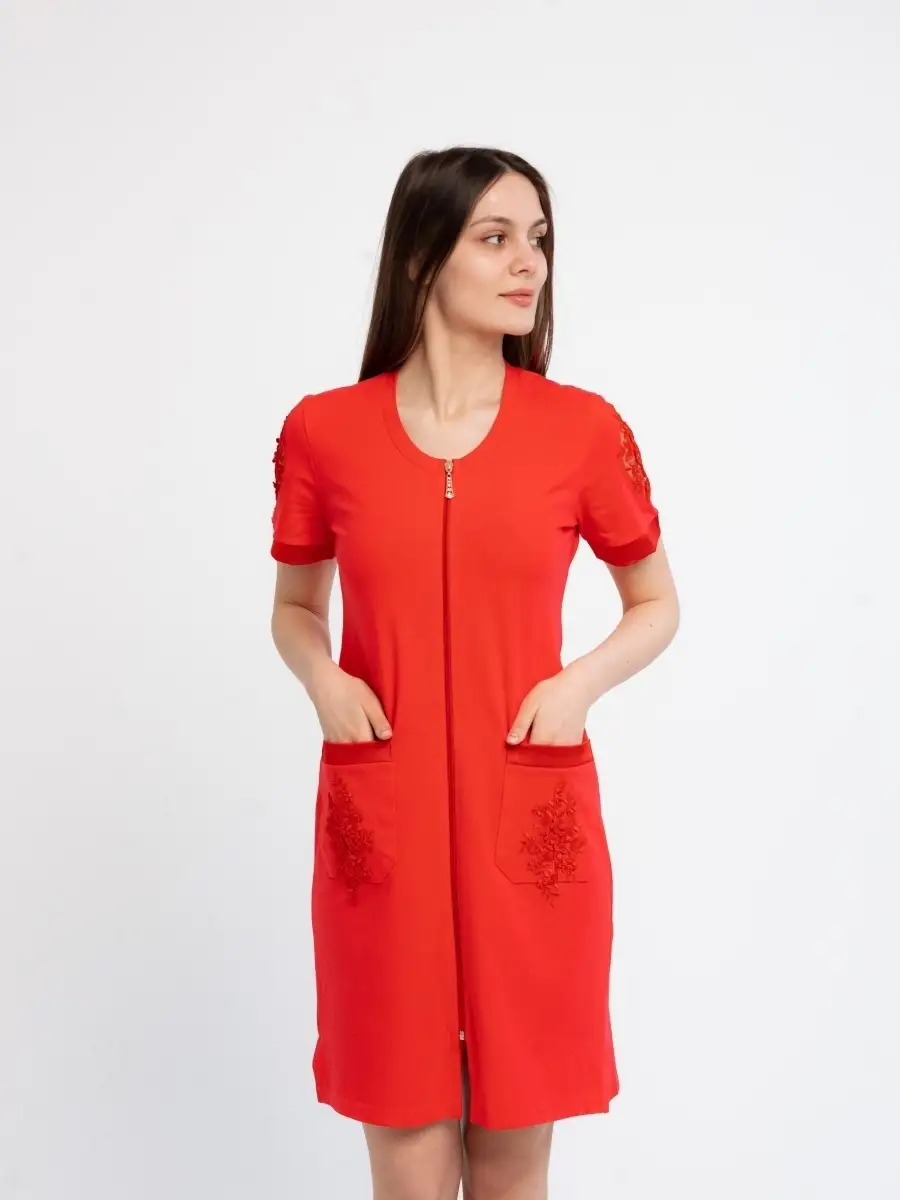 Качественный домашний женский халат из высококачественного трикотажа. Модный халат на молнии, который будет не только удобным, но и стильным предметом домашнего обихода. Оригинальный дизайн средней длины с круглым вырезом, глубокими накладными карманами и короткими рукавами. Красивое домашнее платье сделает ваш образ элегантным и нарядным. Удачная модель красивого халата позволит вам расслабиться и выглядеть великолепно после трудного дня. Домашний халат молодежный женский, домашняя женская одежда, халат для дома может послужить прекрасным подарком для мамы, жены, сестры, подруги на 8 марта, день рождения. Рекомендуется стирать в стиральной машине или вручную при температуре 30 С.