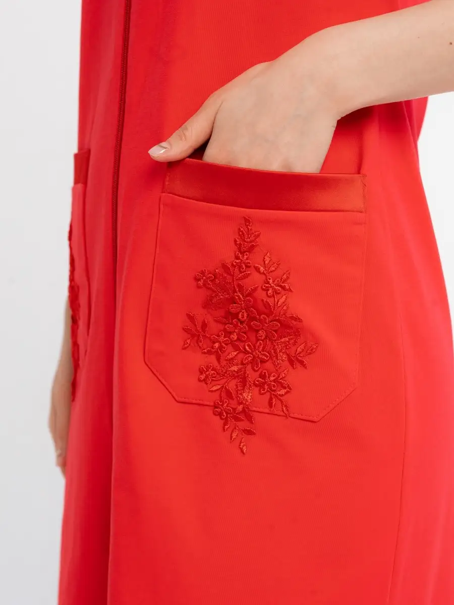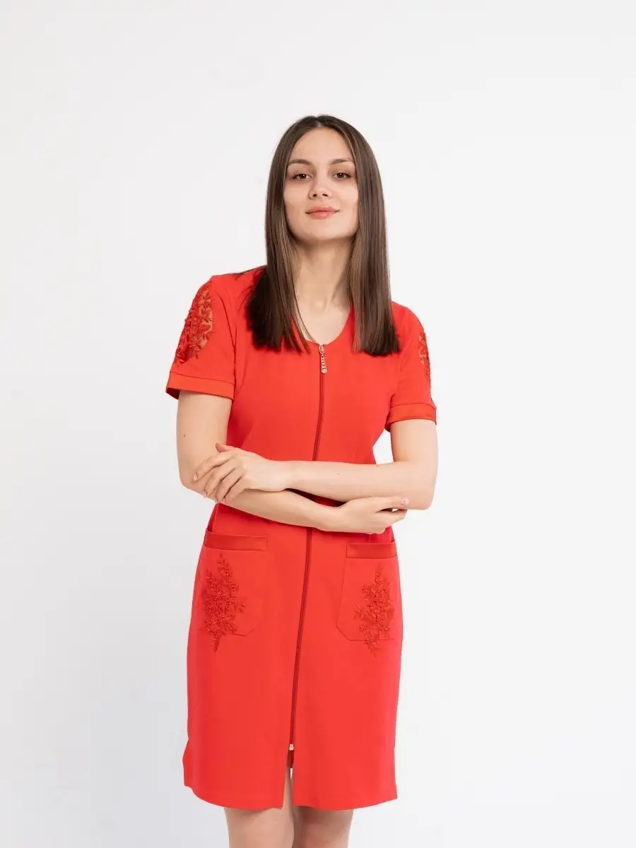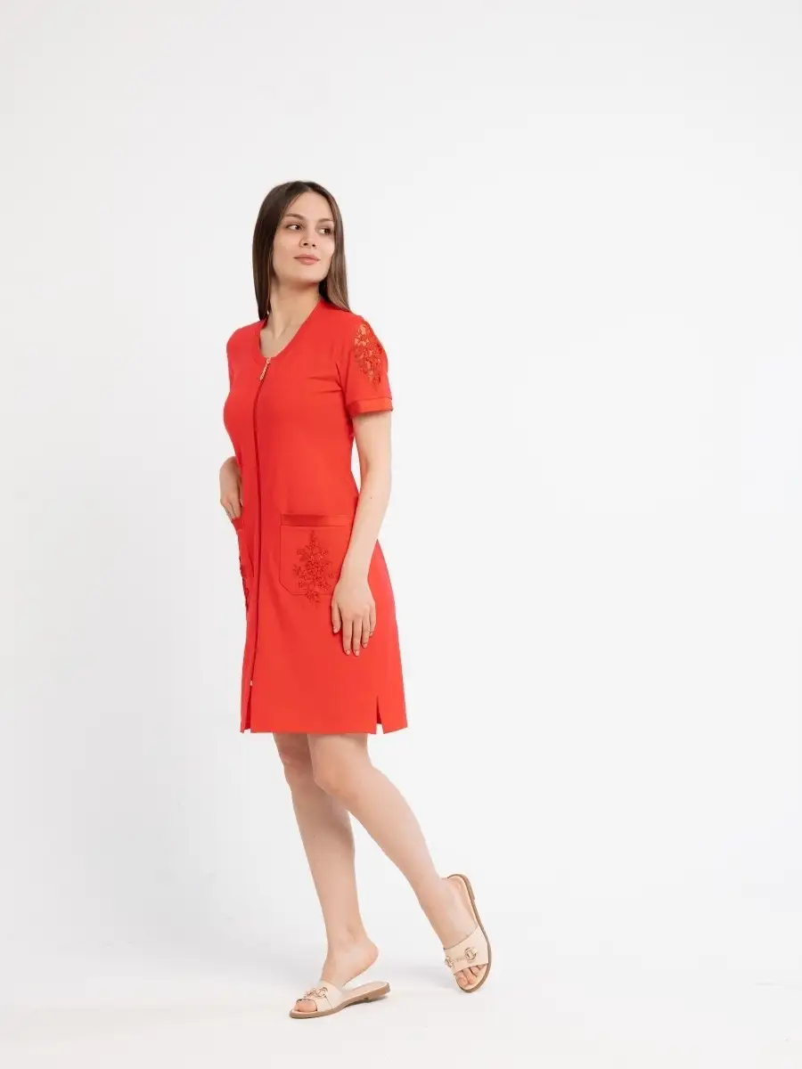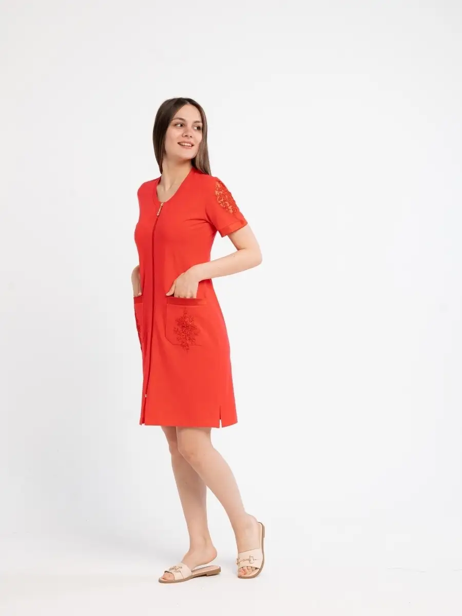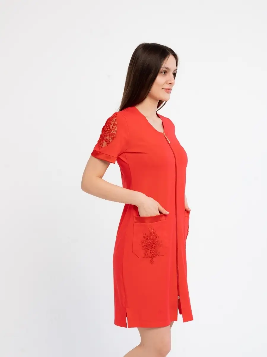 Качественный домашний женский халат из высококачественного трикотажа. Модный халат на молнии, который будет не только удобным, но и стильным предметом домашнего обихода. Оригинальный дизайн средней длины с круглым вырезом, глубокими накладными карманами и короткими рукавами. Красивое домашнее платье сделает ваш образ элегантным и нарядным. Удачная модель красивого халата позволит вам расслабиться и выглядеть великолепно после трудного дня. Домашний халат молодежный женский, домашняя женская одежда, халат для дома может послужить прекрасным подарком для мамы, жены, сестры, подруги на 8 марта, день рождения. Рекомендуется стирать в стиральной машине или вручную при температуре 30 С.