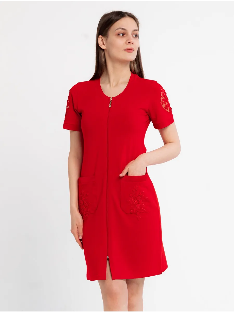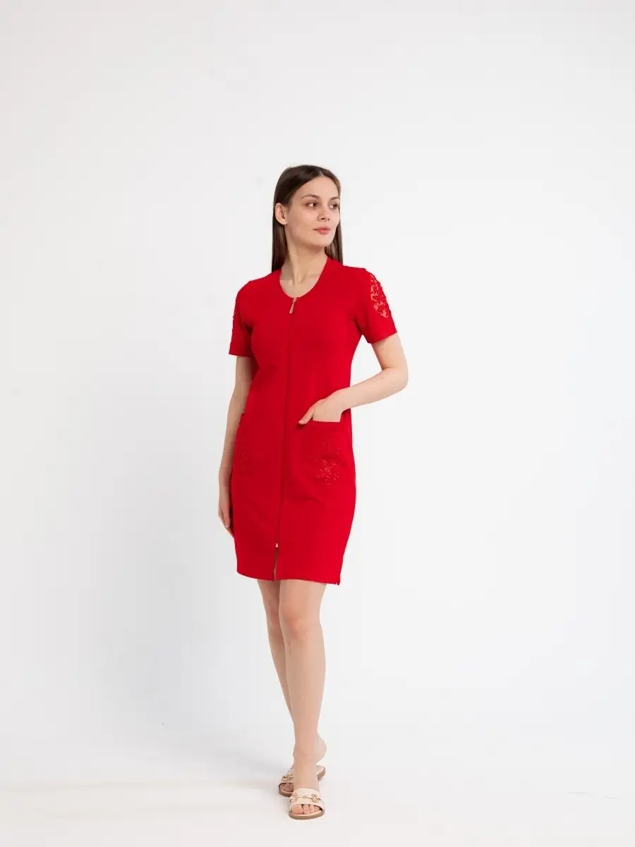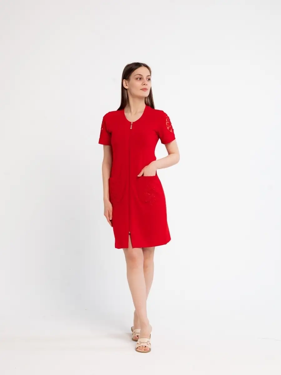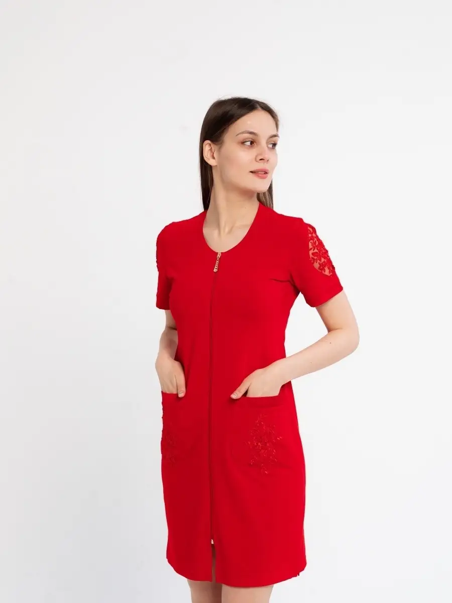 Качественный домашний женский халат из высококачественного трикотажа. Модный халат на молнии, который будет не только удобным, но и стильным предметом домашнего обихода. Оригинальный дизайн средней длины с круглым вырезом, глубокими накладными карманами и короткими рукавами. Красивое домашнее платье сделает ваш образ элегантным и нарядным. Удачная модель красивого халата позволит вам расслабиться и выглядеть великолепно после трудного дня. Домашний халат молодежный женский, домашняя женская одежда, халат для дома может послужить прекрасным подарком для мамы, жены, сестры, подруги на 8 марта, день рождения. Рекомендуется стирать в стиральной машине или вручную при температуре 30 С.