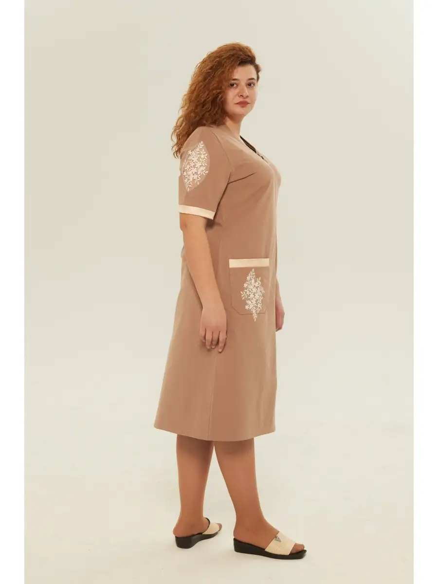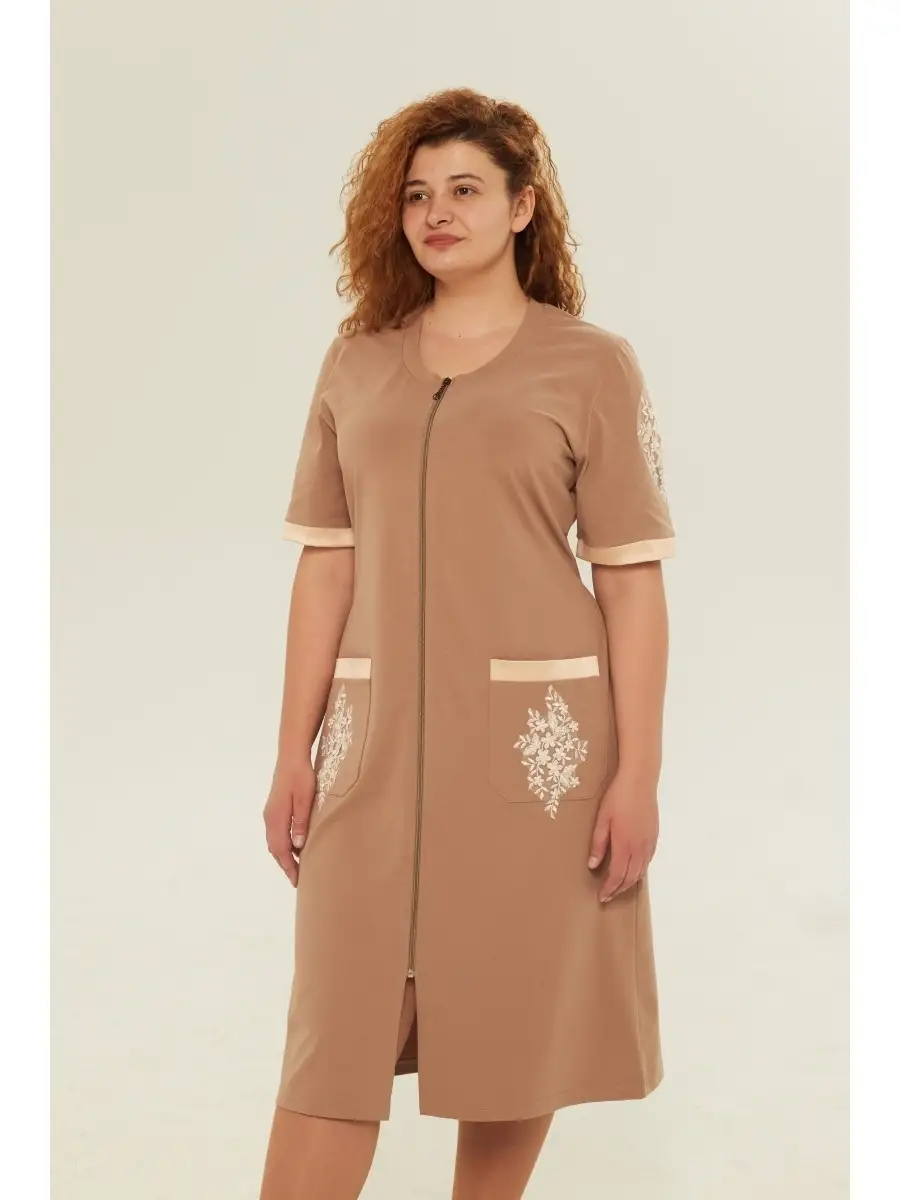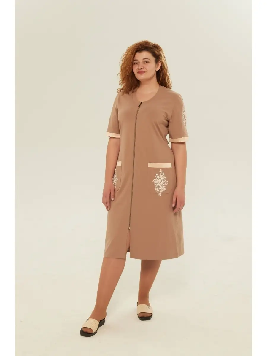 Домашний халат женский больших размеров из трикотажного полотна высокого качества. Красивый и практичный домашний халат на молнии с круглым вырезом, короткими рукавами и глубокими накладными карманами. Халат кружевной позволит выглядеть ярко и красиво дома или на даче. Гипюр с цветочками на рукавах и карманах украшают халат и придают женственность. Халат послужит прекрасным подарком маме, сестре, подруге, родным и близким. Может понравиться тем, кто кто ищет красивую одежду для дома, домашнюю качественную одежду. Большая размерная сетка включает в себя размеры с 50 по 60. При соблюдении рекомендаций по уходу и эксплуатации будете носить с удовольствием очень долго.