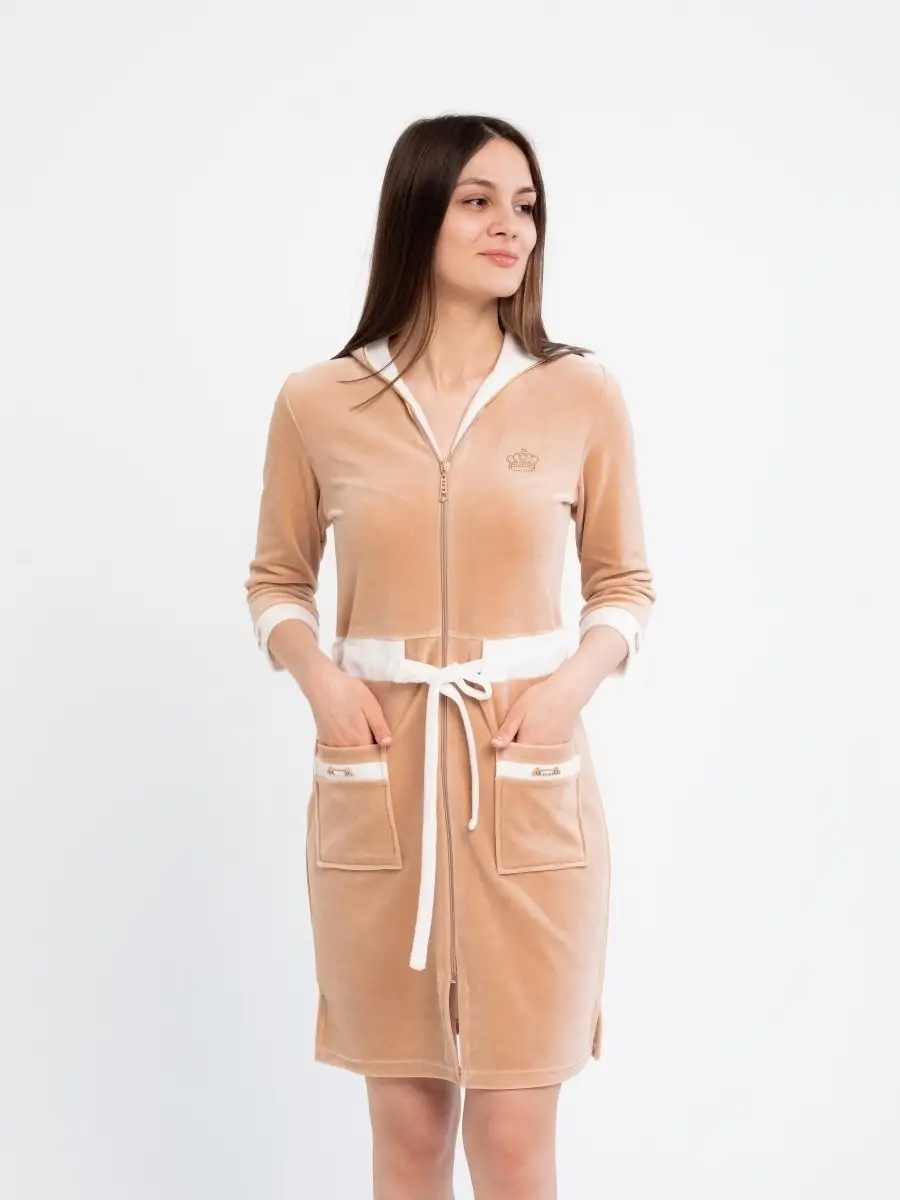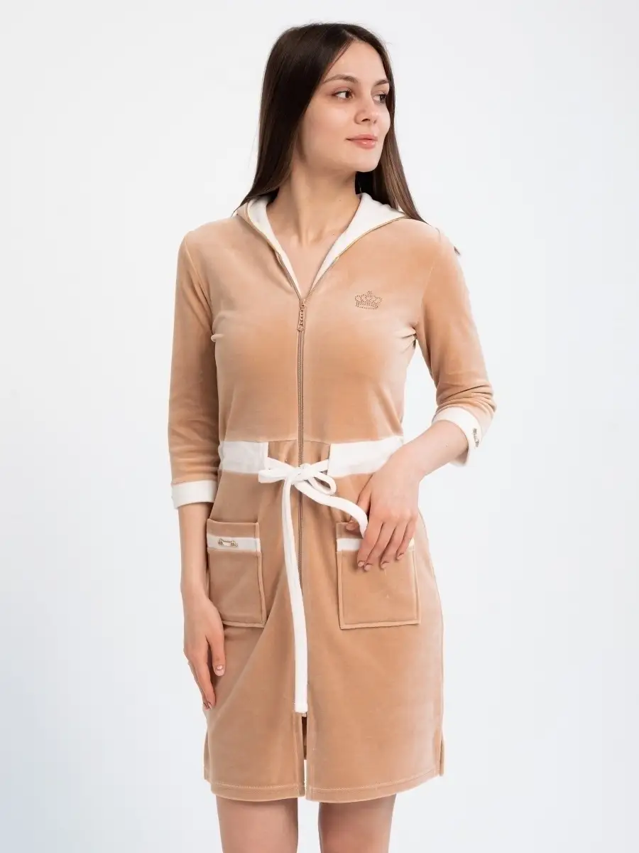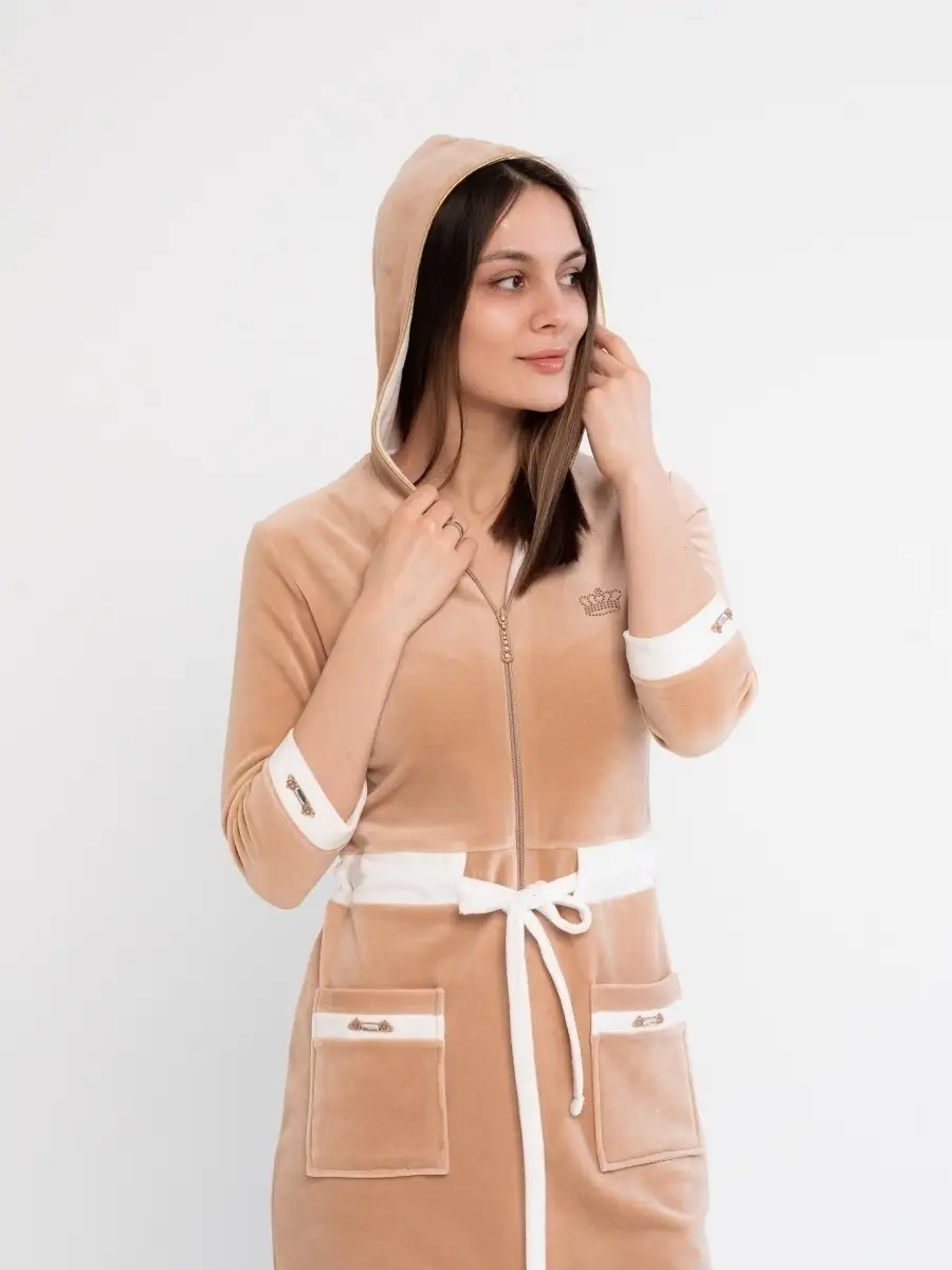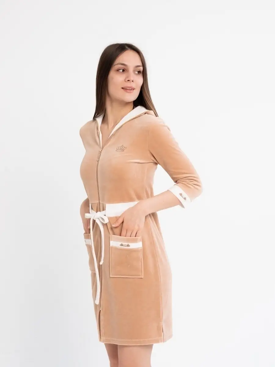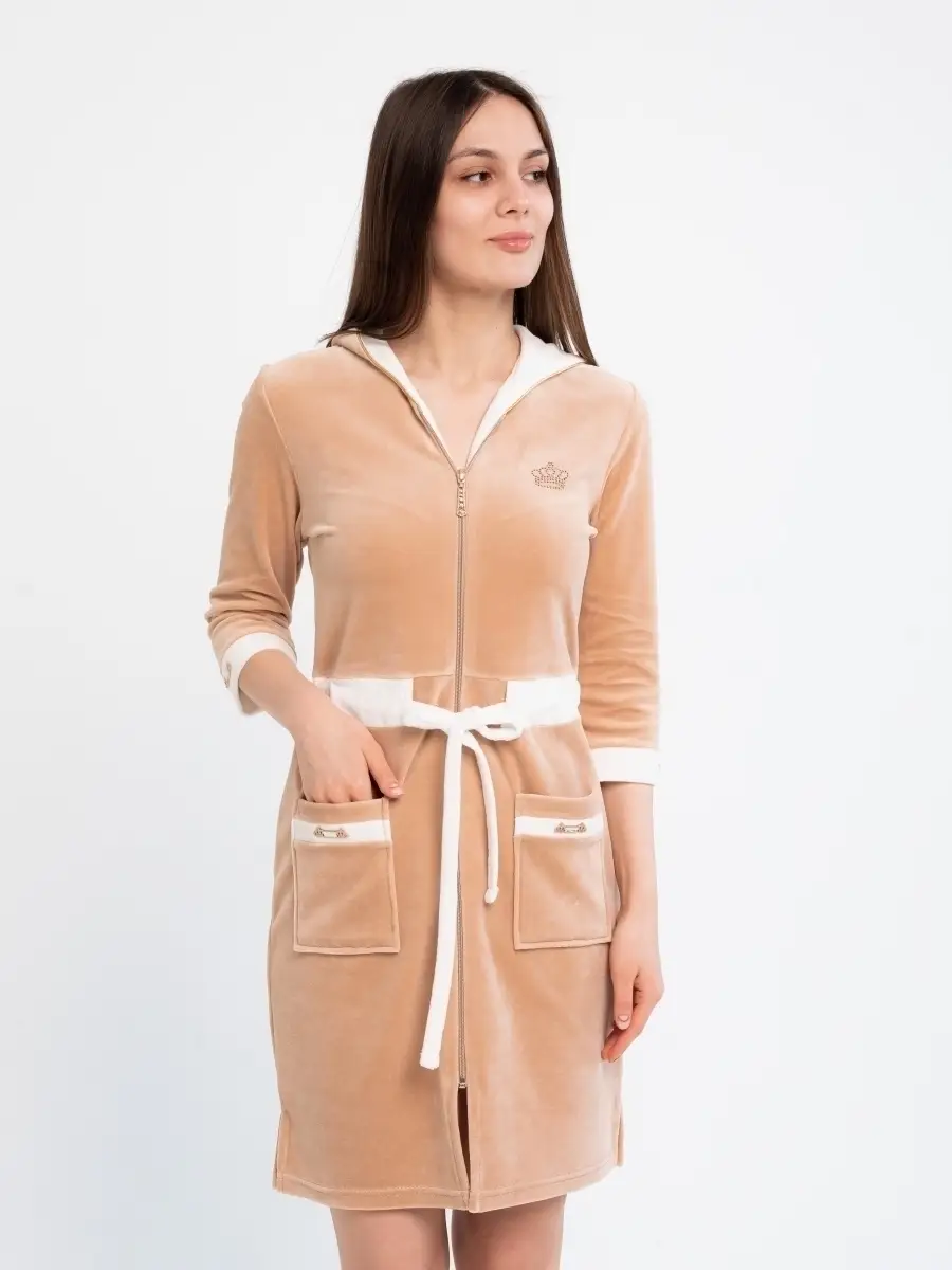 Молодежный велюровый халат с капюшоном из полотна высшего качества. Халат на молнии, с завязками спереди и накладными карманами станет стильной и удобной одеждой для дома. Женский халатик идеально сидит, не деформируется, не линяет. В нем вам будет комфортно и уютно посмотреть любимые фильмы или почитать книги. Халат можно носить дома, на даче, в бане или больнице. Халатик женский домашний послужит отличным подарком на любой праздник. Для тех, кто хочет посвободнее, рекомендуем заказывать на 1 размер больше.