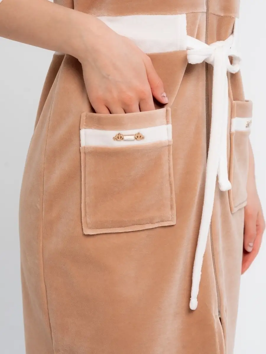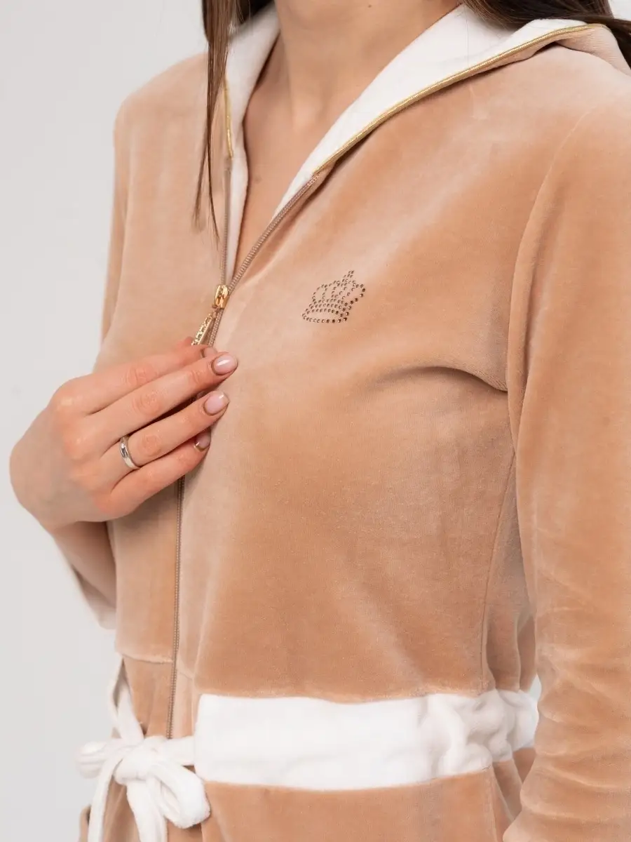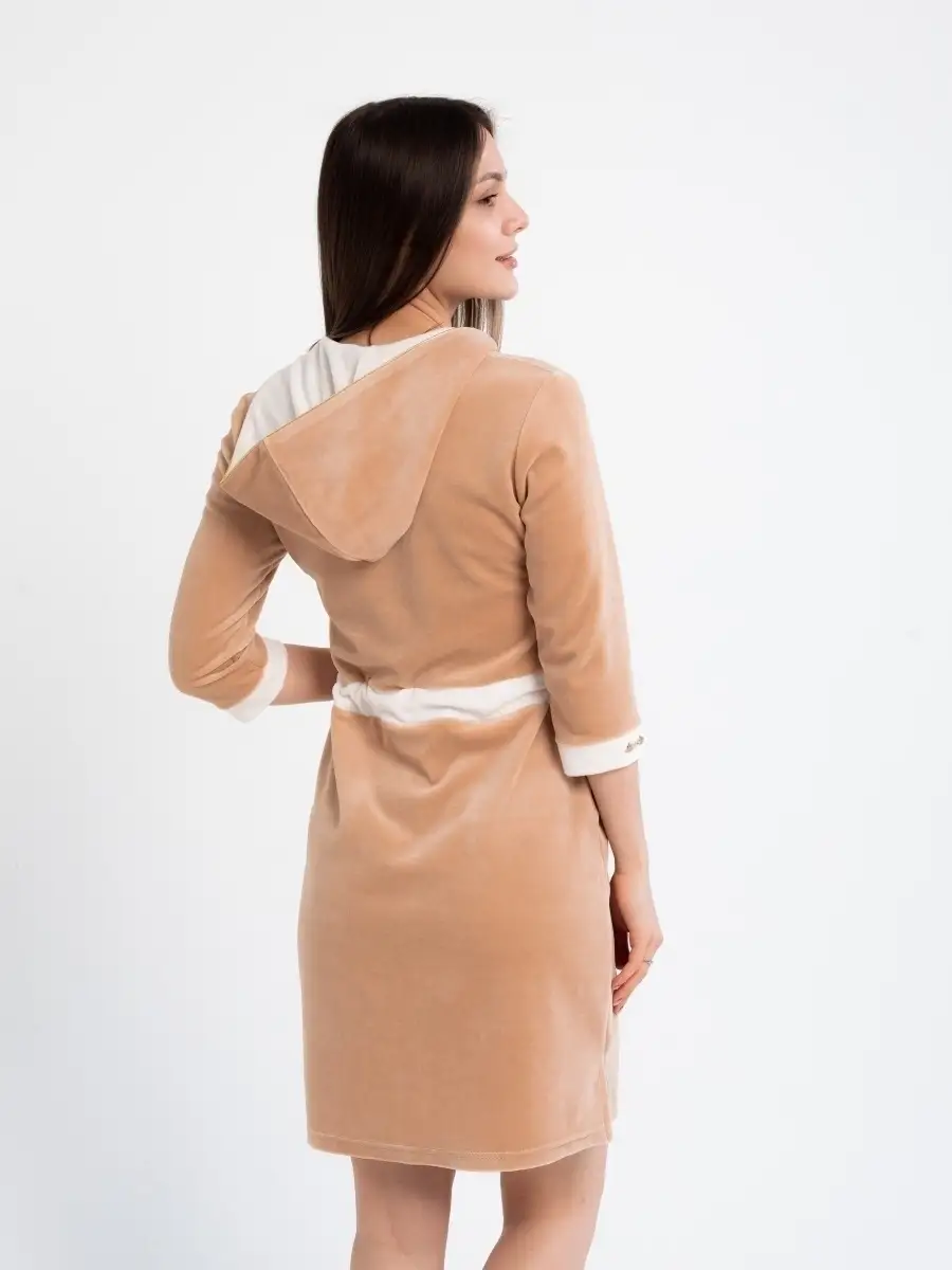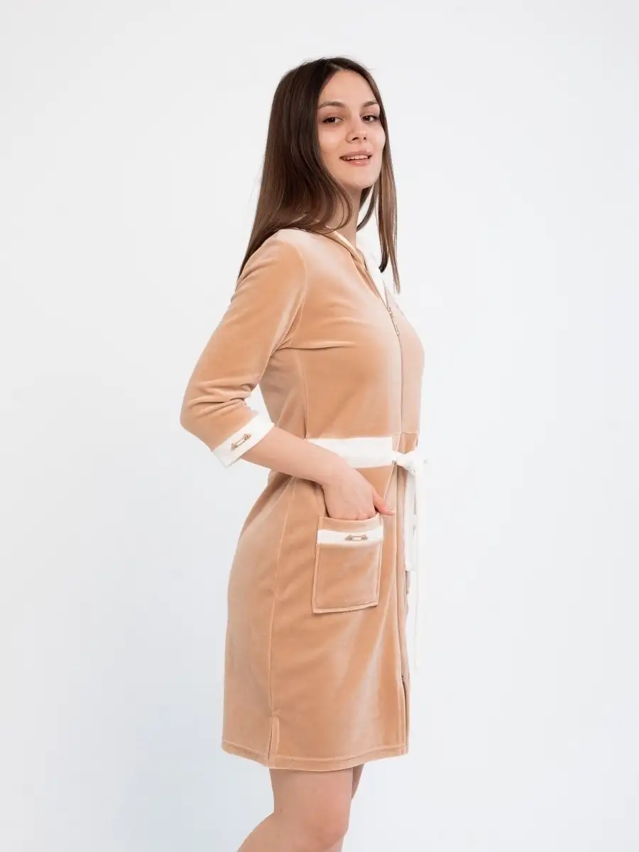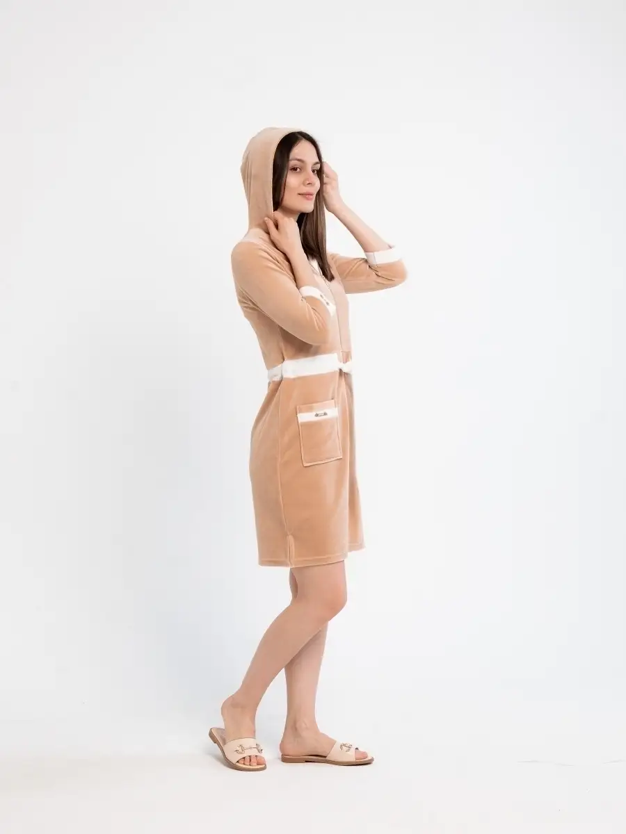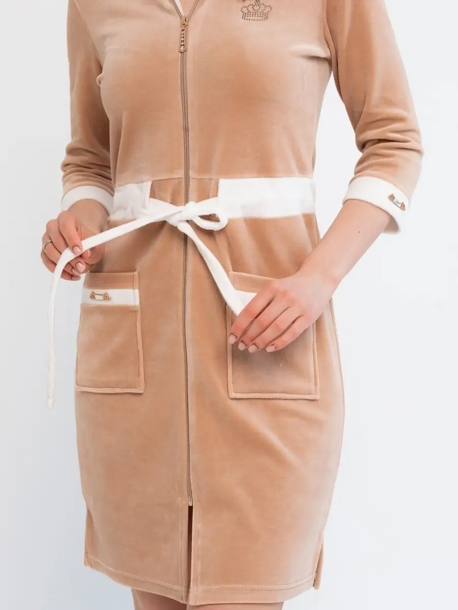 Молодежный велюровый халат с капюшоном из полотна высшего качества. Халат на молнии, с завязками спереди и накладными карманами станет стильной и удобной одеждой для дома. Женский халатик идеально сидит, не деформируется, не линяет. В нем вам будет комфортно и уютно посмотреть любимые фильмы или почитать книги. Халат можно носить дома, на даче, в бане или больнице. Халатик женский домашний послужит отличным подарком на любой праздник. Для тех, кто хочет посвободнее, рекомендуем заказывать на 1 размер больше.