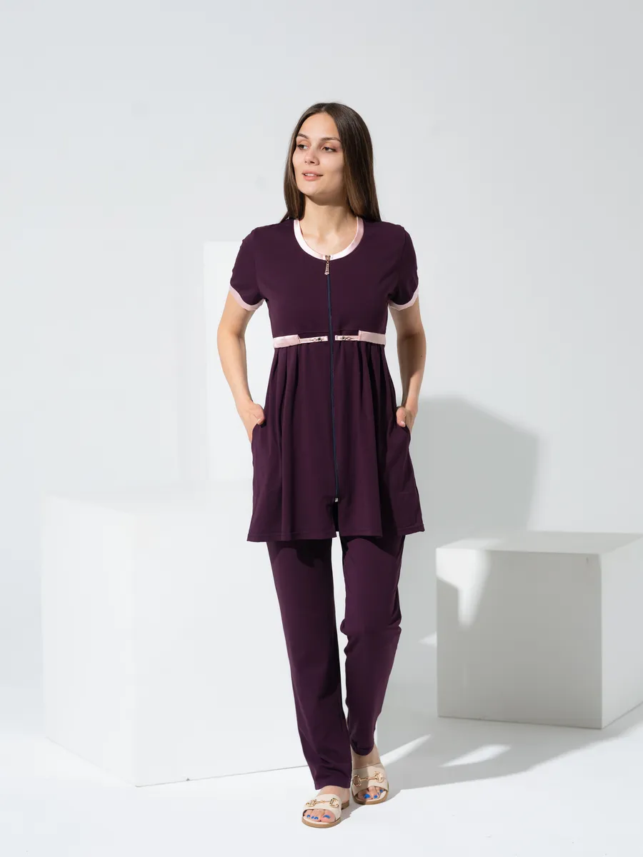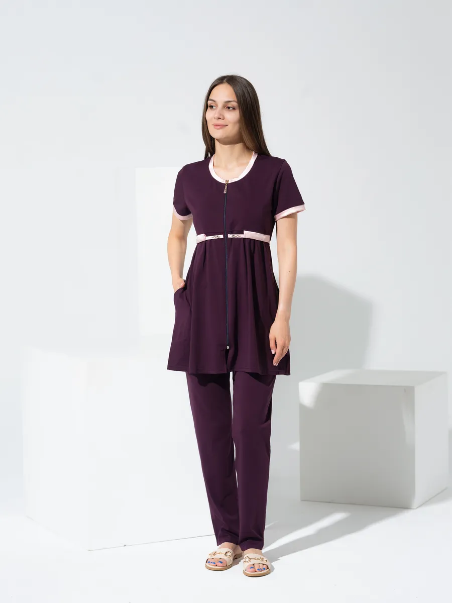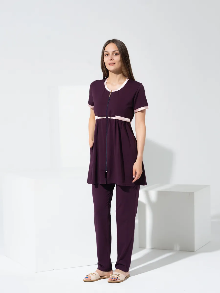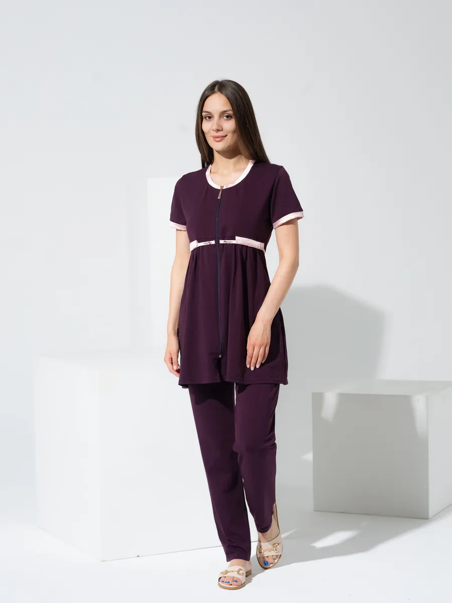 Туника с короткими рукавами и атласной отделкой, дополненная прямыми брюками с завязками сзади, создает элегантный и удобный образ. Туника с брюками позволит девушке дома и в больнице выглядеть женственно. Домашний костюм для роддома, для кормления позволяет будущей маме выглядеть стильно в любом месте.