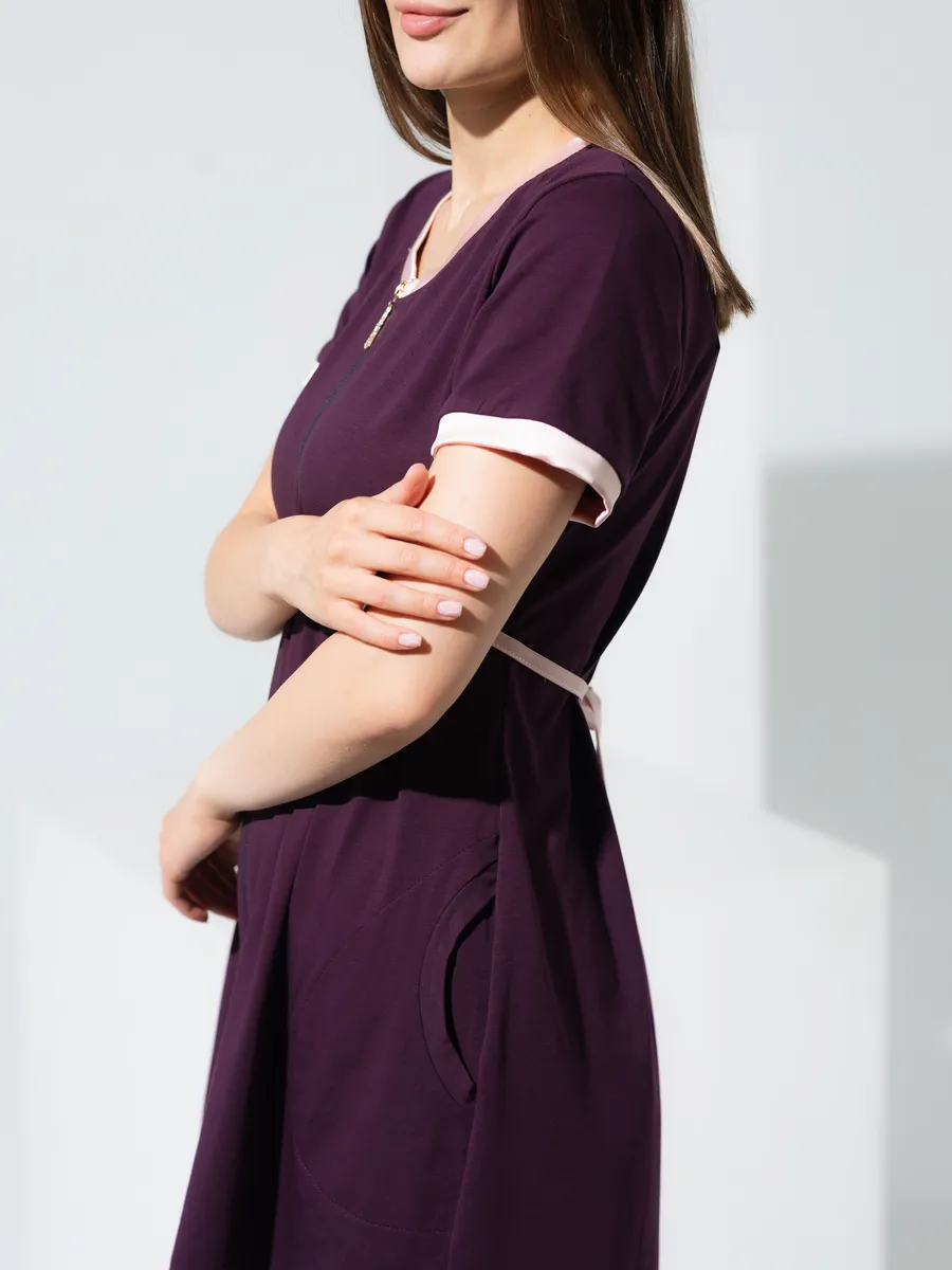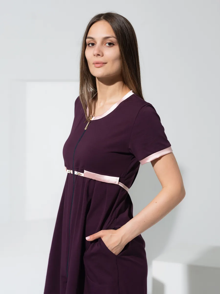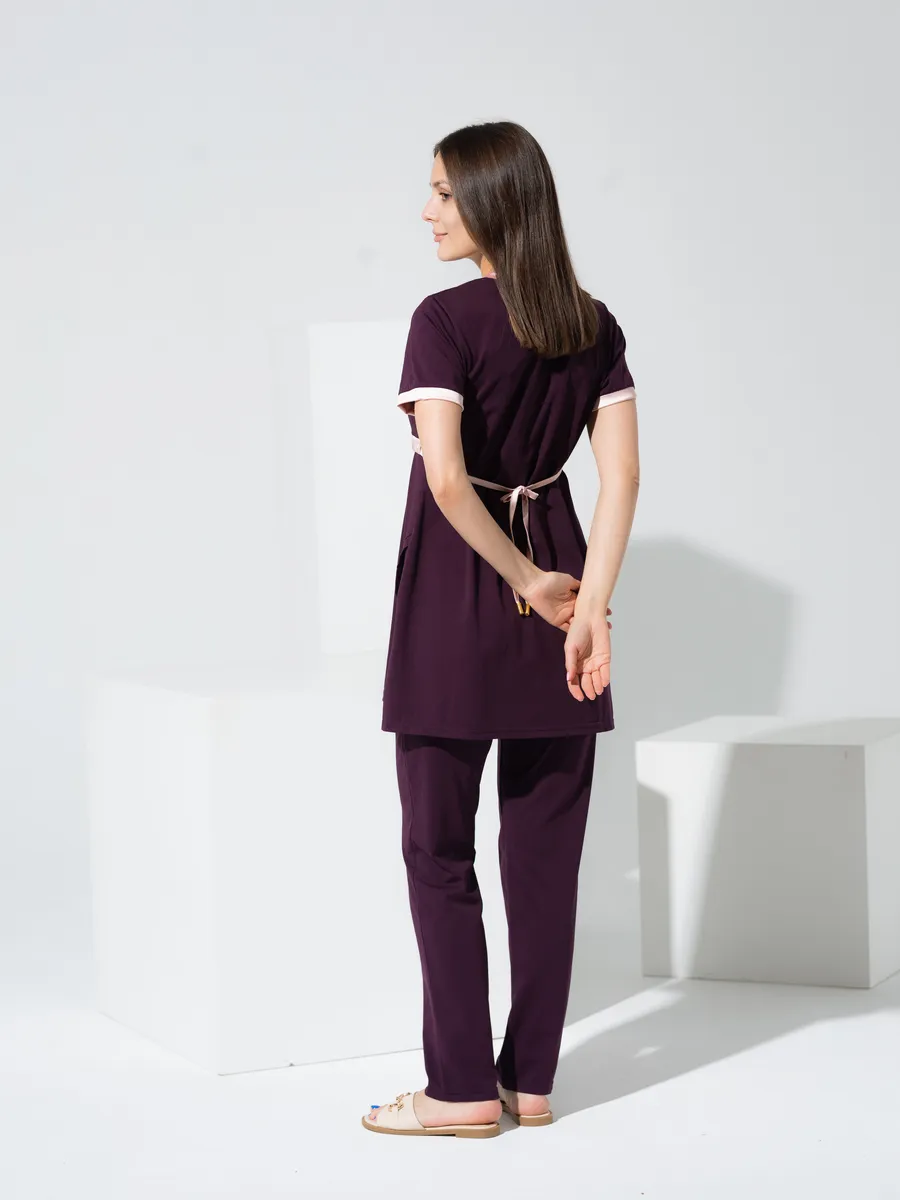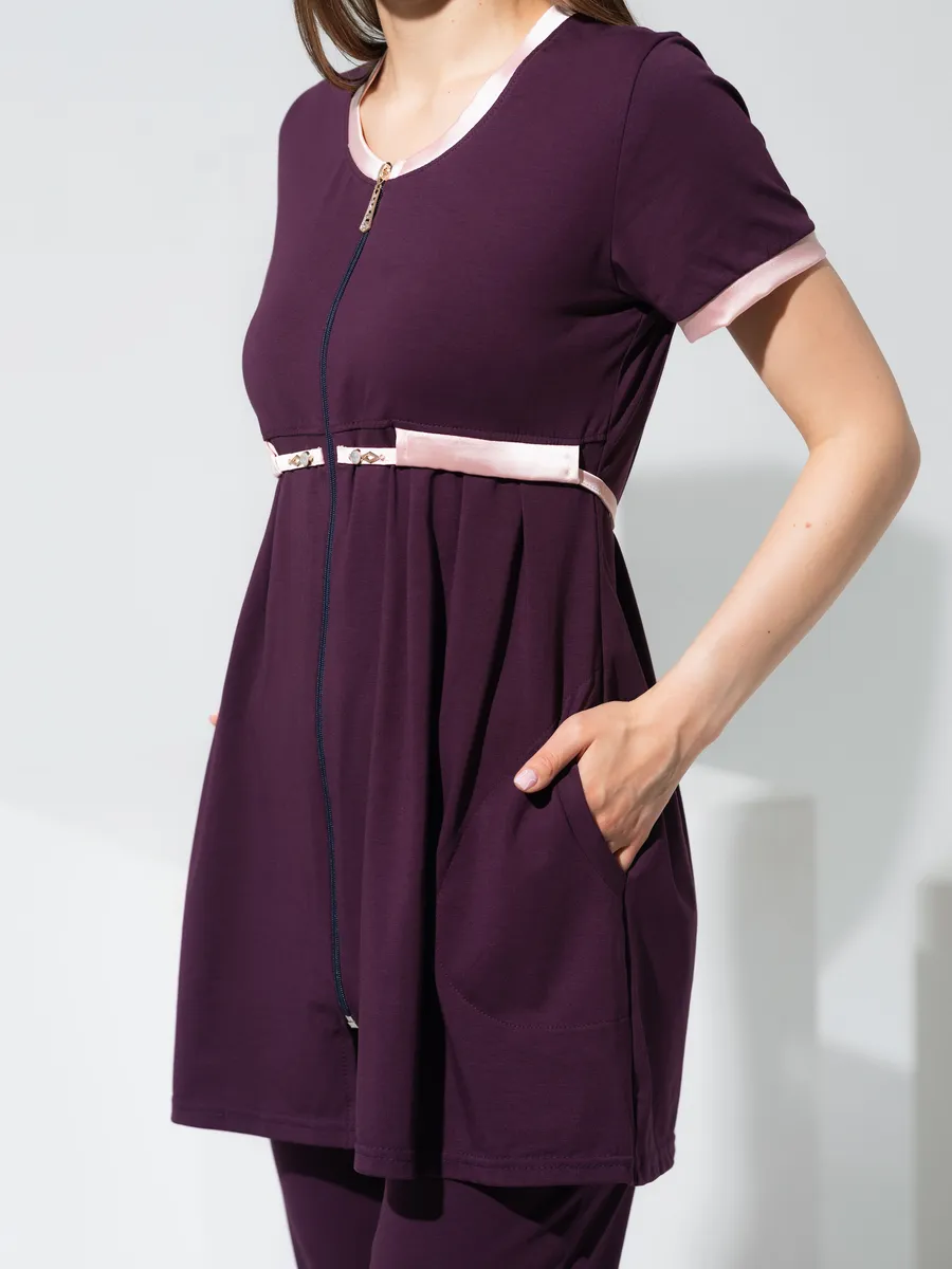 Туника с короткими рукавами и атласной отделкой, дополненная прямыми брюками с завязками сзади, создает элегантный и удобный образ. Туника с брюками позволит девушке дома и в больнице выглядеть женственно. Домашний костюм для роддома, для кормления позволяет будущей маме выглядеть стильно в любом месте.