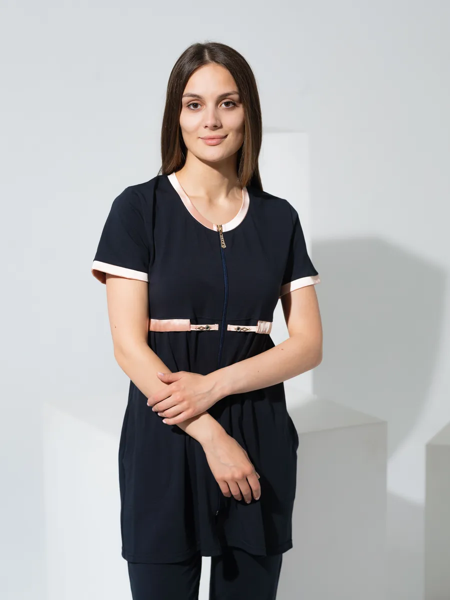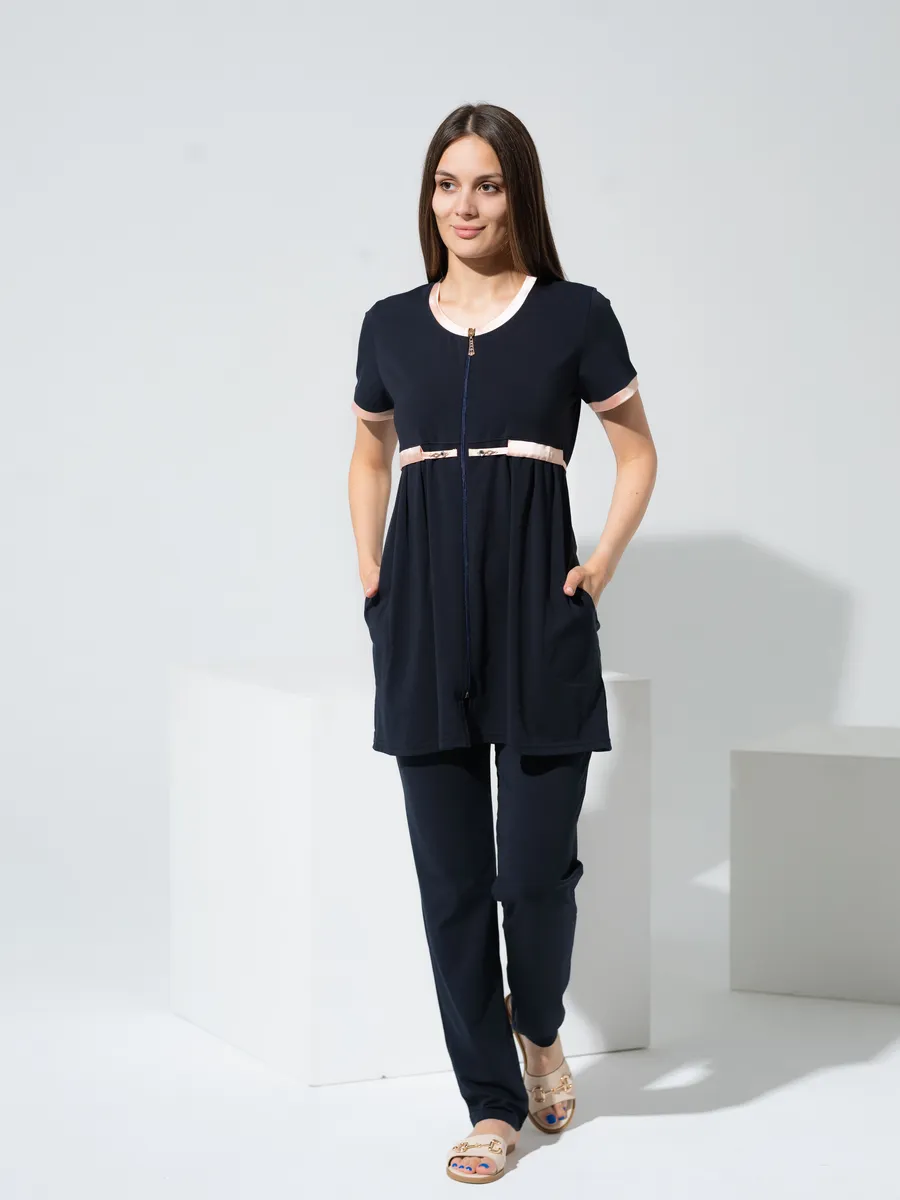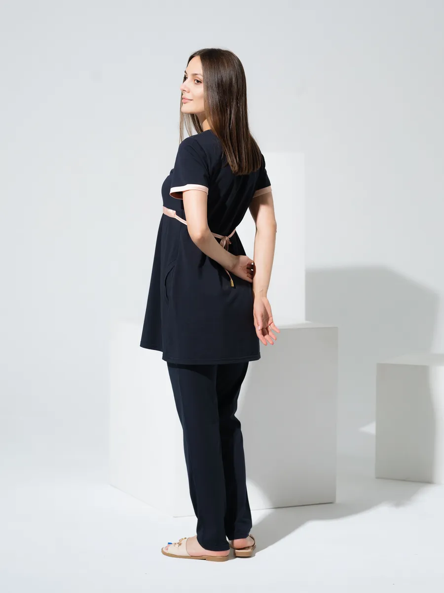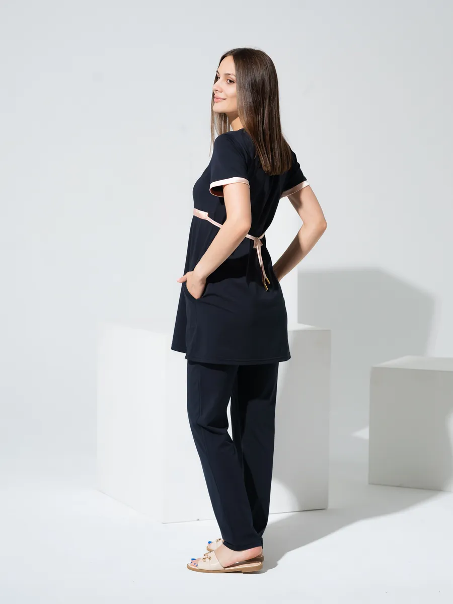 Туника с короткими рукавами и атласной отделкой, дополненная прямыми брюками с завязками сзади, создает элегантный и удобный образ. Туника с брюками позволит девушке дома и в больнице выглядеть женственно. Домашний костюм для роддома, для кормления позволяет будущей маме выглядеть стильно в любом месте.