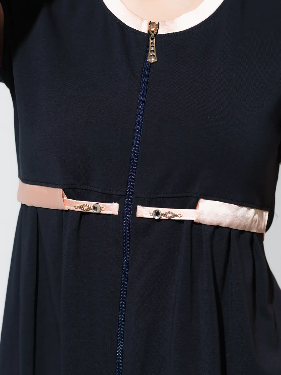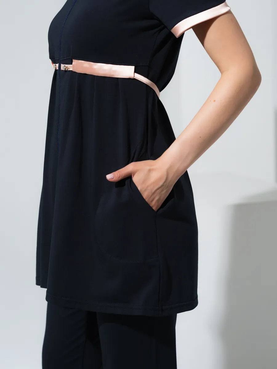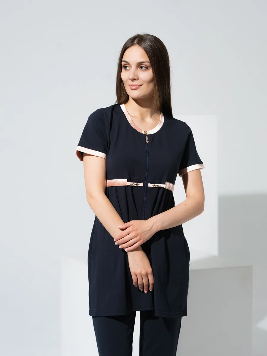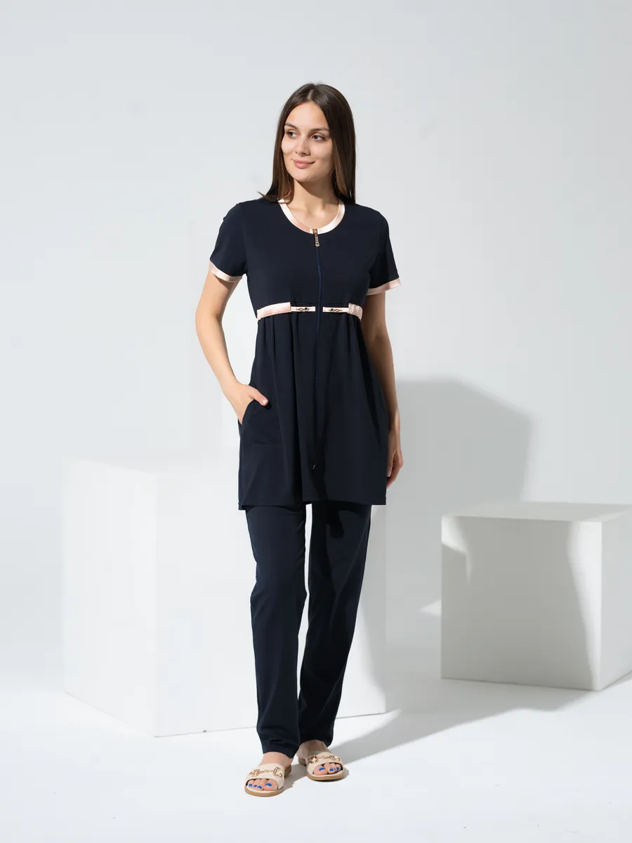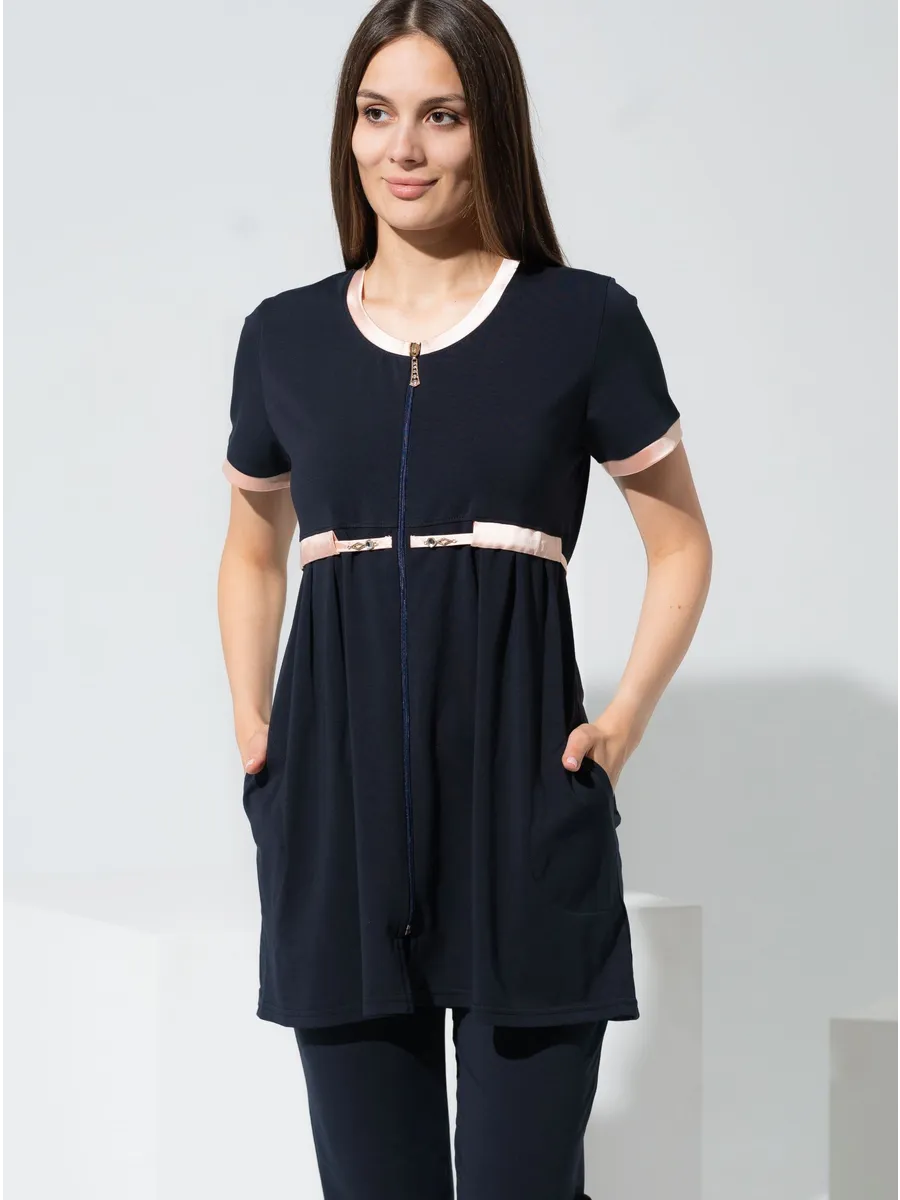 Туника с короткими рукавами и атласной отделкой, дополненная прямыми брюками с завязками сзади, создает элегантный и удобный образ. Туника с брюками позволит девушке дома и в больнице выглядеть женственно. Домашний костюм для роддома, для кормления позволяет будущей маме выглядеть стильно в любом месте.