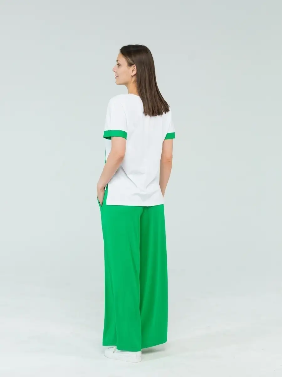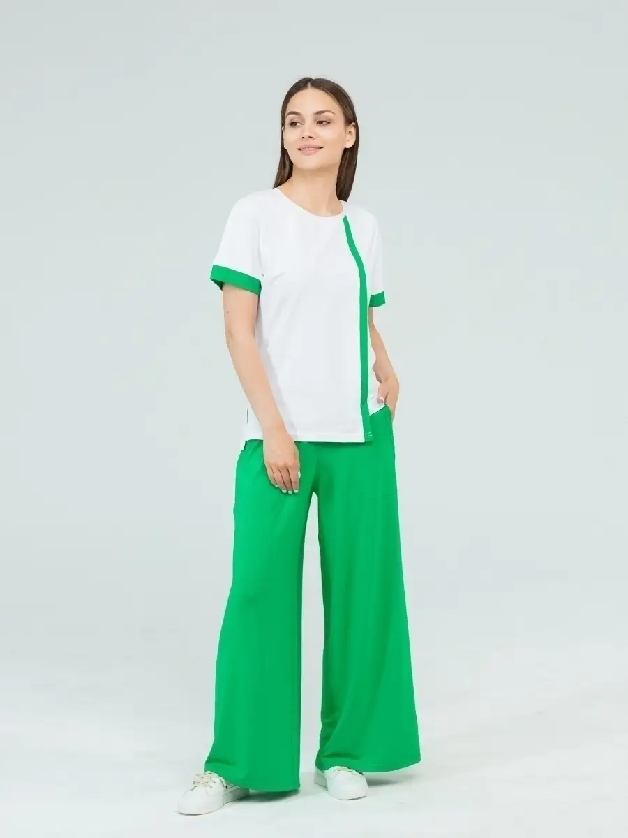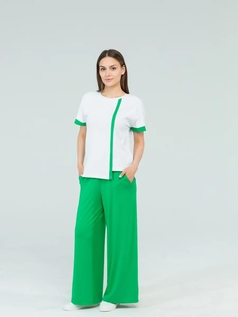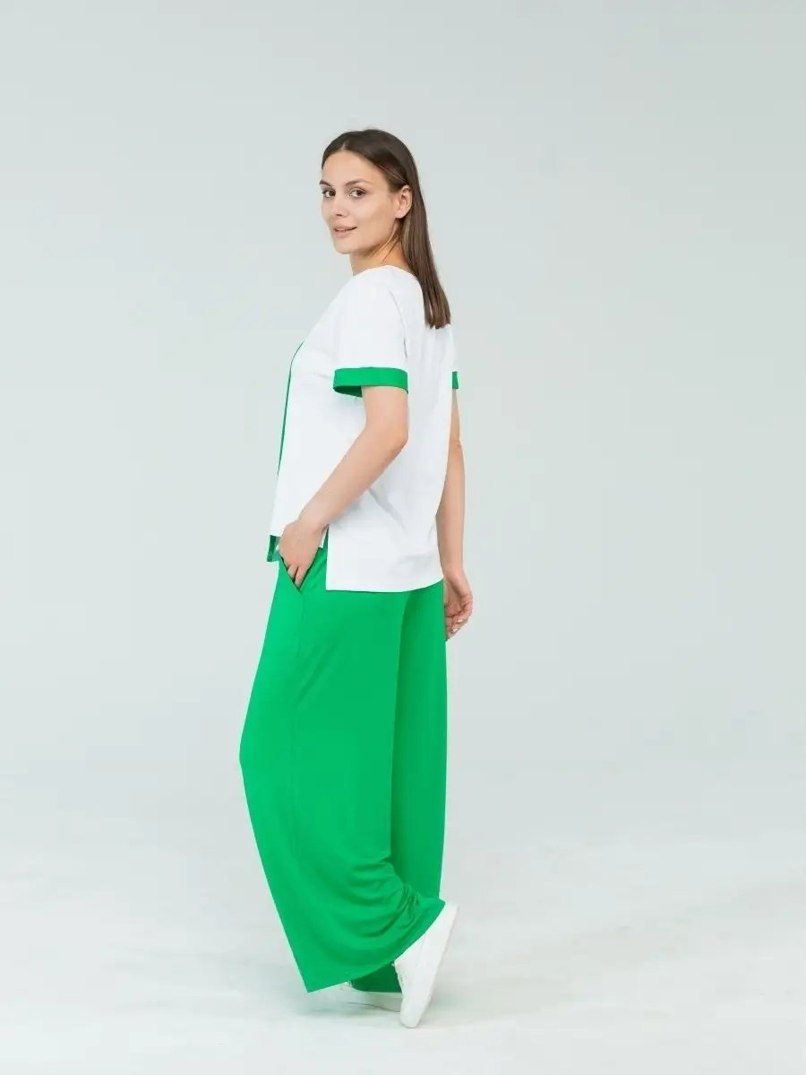 Летний стильный женский костюм. Костюм женский с широкими брюками поможет вам быть в тренде этого сезона. В комплект входят широкие брюки палаццо с глубокими карманами, и удлиненная футболка с боковыми разрезами. Брюки палаццо подходят для любого типа фигуры, скрывают ее недостатки и подчеркивают достоинства. Костюм из мягкой футболки со спущенным рукавом и широкими брюками прекрасно подойдет под лаконичный офисный стиль, для вечерних и повседневных образов, для прогулок и занятий спортом, а также в качестве костюма для дома. Костюм пошит из хлопковой ткани, и в нем будет комфортно даже в сильную жару. Не теряет форму после многочисленных стирок. Универсальный и практичный женский костюм прекрасно подойдет девушке, женщине, подростку для повседневных и вечерних прогулок, путешествий, отдыха на море, занятий спортом. Брюки палаццо на поясе из широкой эластичной резинки не сковывают движений, прекрасно сидят на любой фигуре, очень комфортны в носке, подойдет и для беременных.