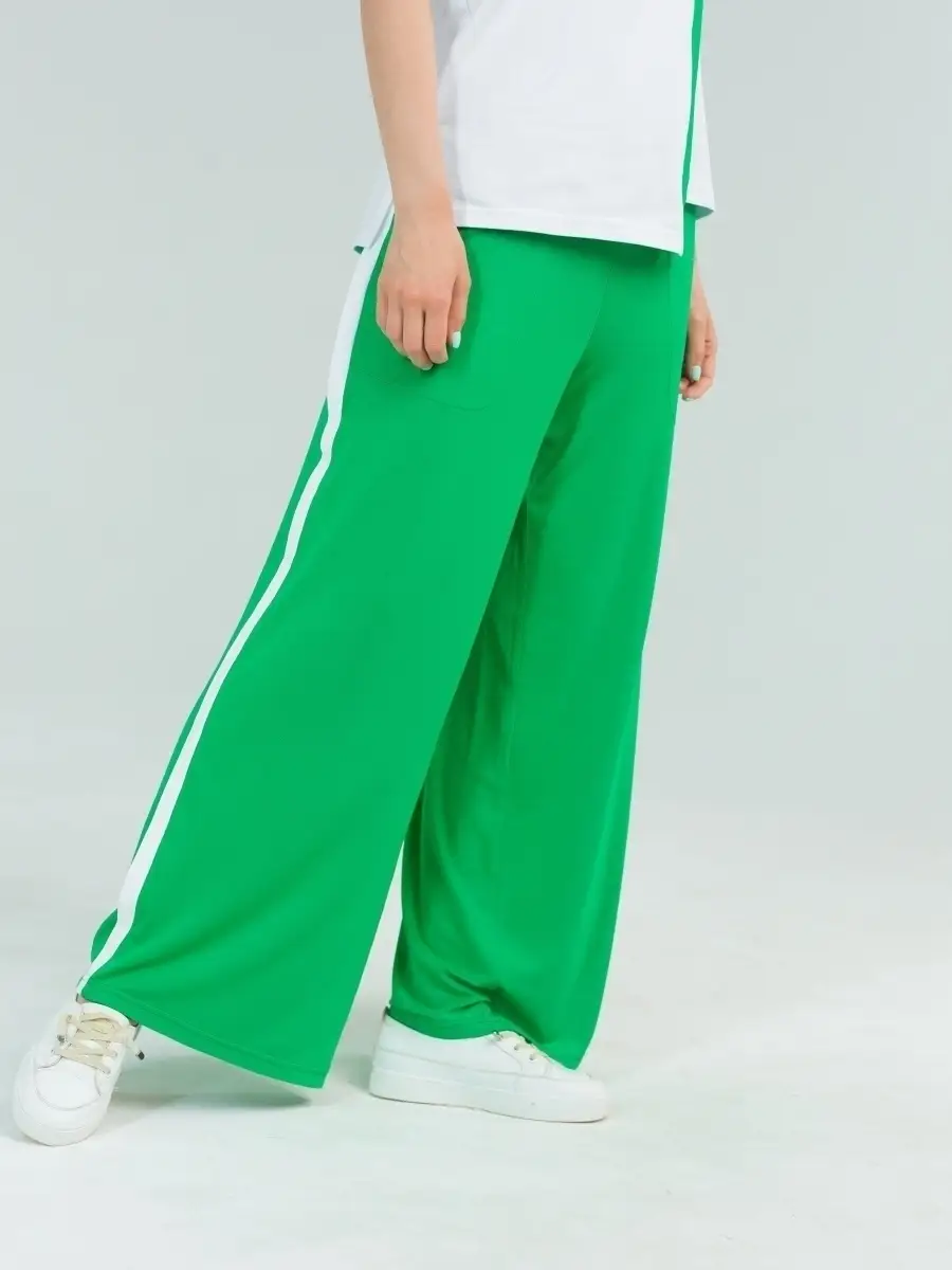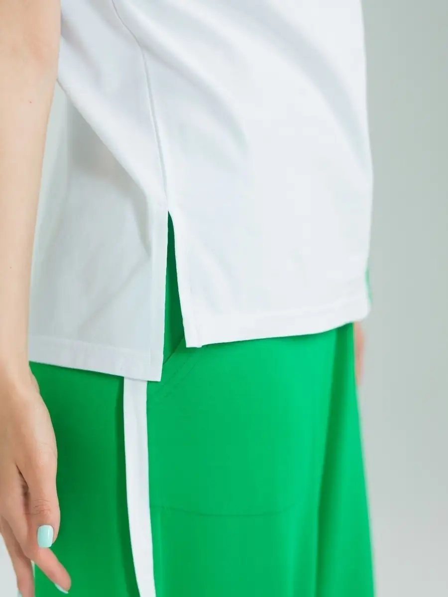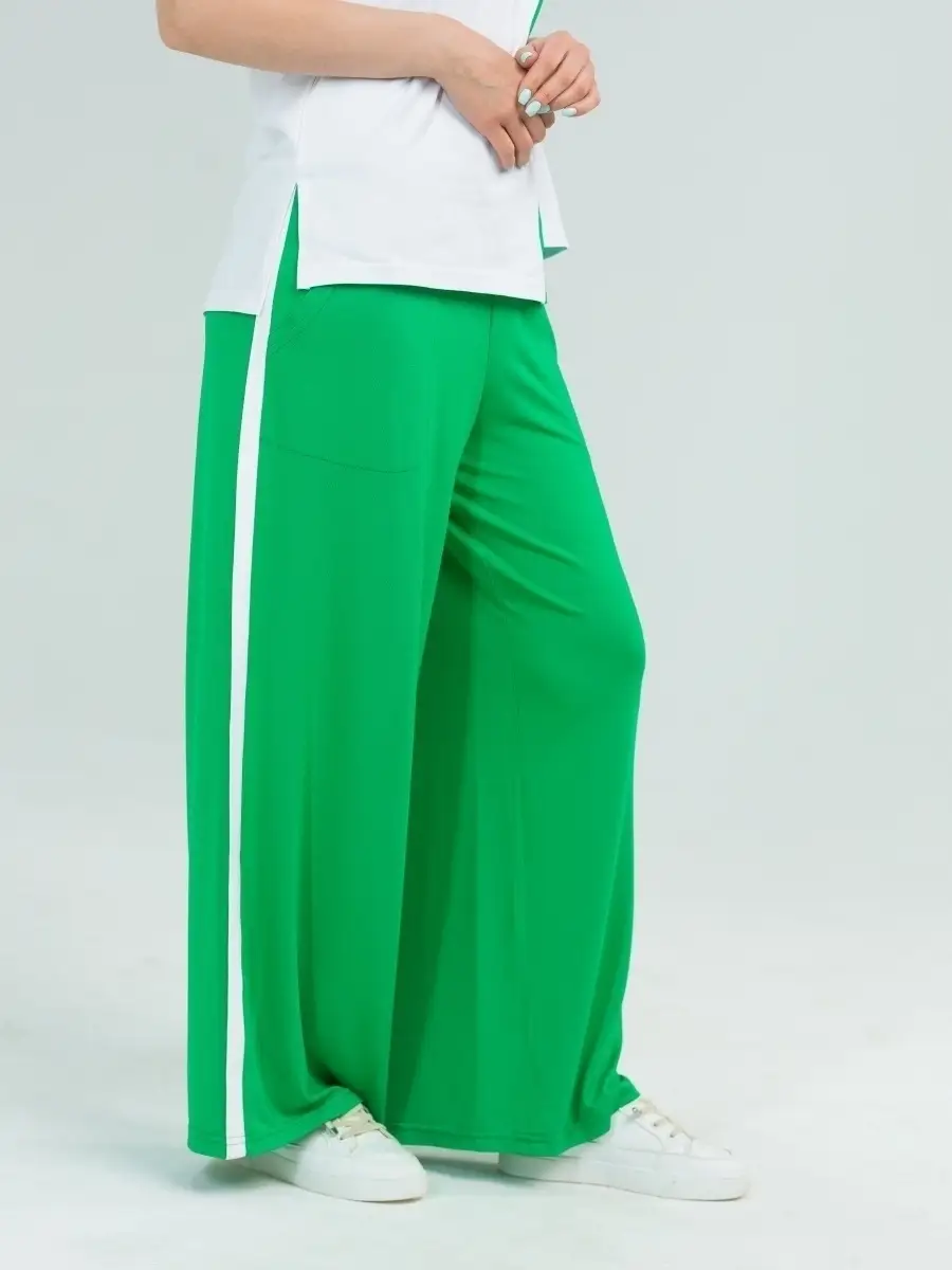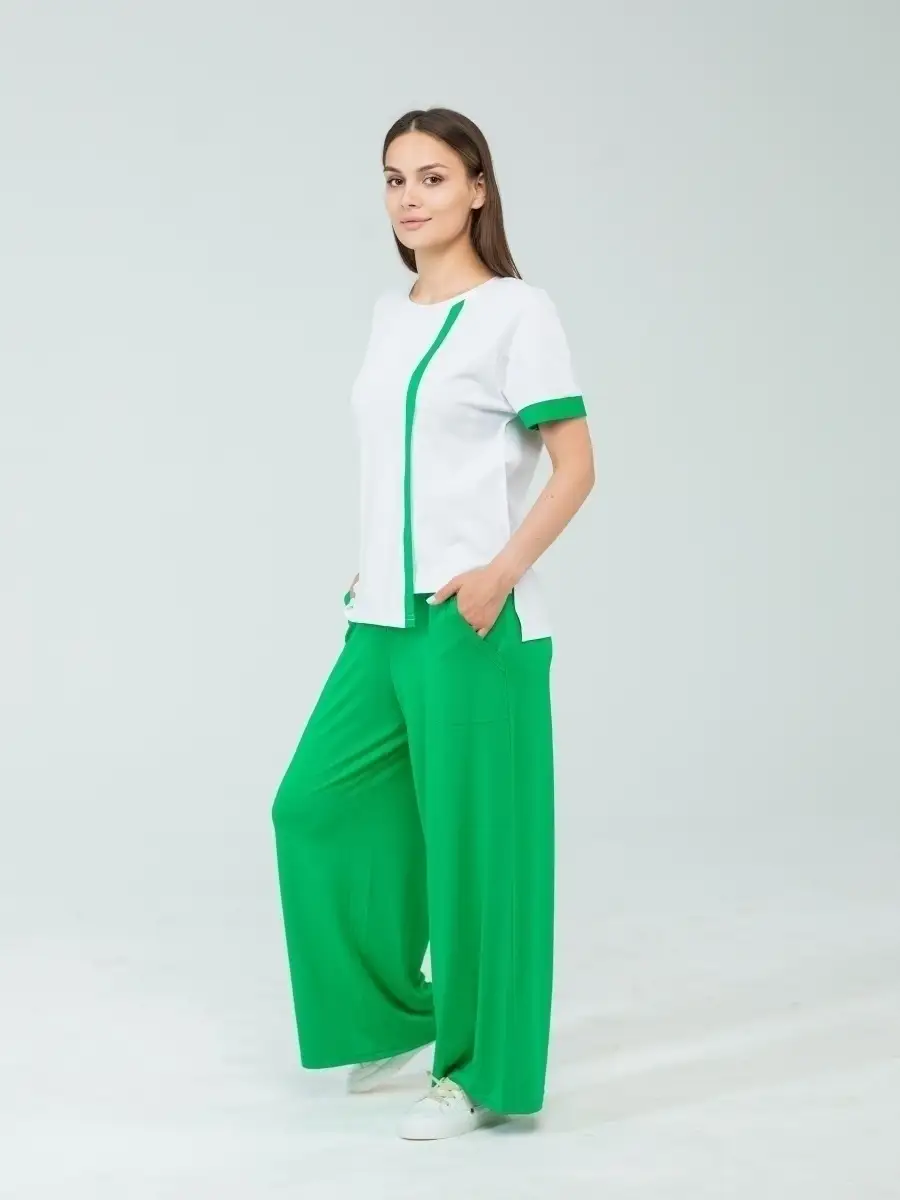 Летний стильный женский костюм. Костюм женский с широкими брюками поможет вам быть в тренде этого сезона. В комплект входят широкие брюки палаццо с глубокими карманами, и удлиненная футболка с боковыми разрезами. Брюки палаццо подходят для любого типа фигуры, скрывают ее недостатки и подчеркивают достоинства. Костюм из мягкой футболки со спущенным рукавом и широкими брюками прекрасно подойдет под лаконичный офисный стиль, для вечерних и повседневных образов, для прогулок и занятий спортом, а также в качестве костюма для дома. Костюм пошит из хлопковой ткани, и в нем будет комфортно даже в сильную жару. Не теряет форму после многочисленных стирок. Универсальный и практичный женский костюм прекрасно подойдет девушке, женщине, подростку для повседневных и вечерних прогулок, путешествий, отдыха на море, занятий спортом. Брюки палаццо на поясе из широкой эластичной резинки не сковывают движений, прекрасно сидят на любой фигуре, очень комфортны в носке, подойдет и для беременных.