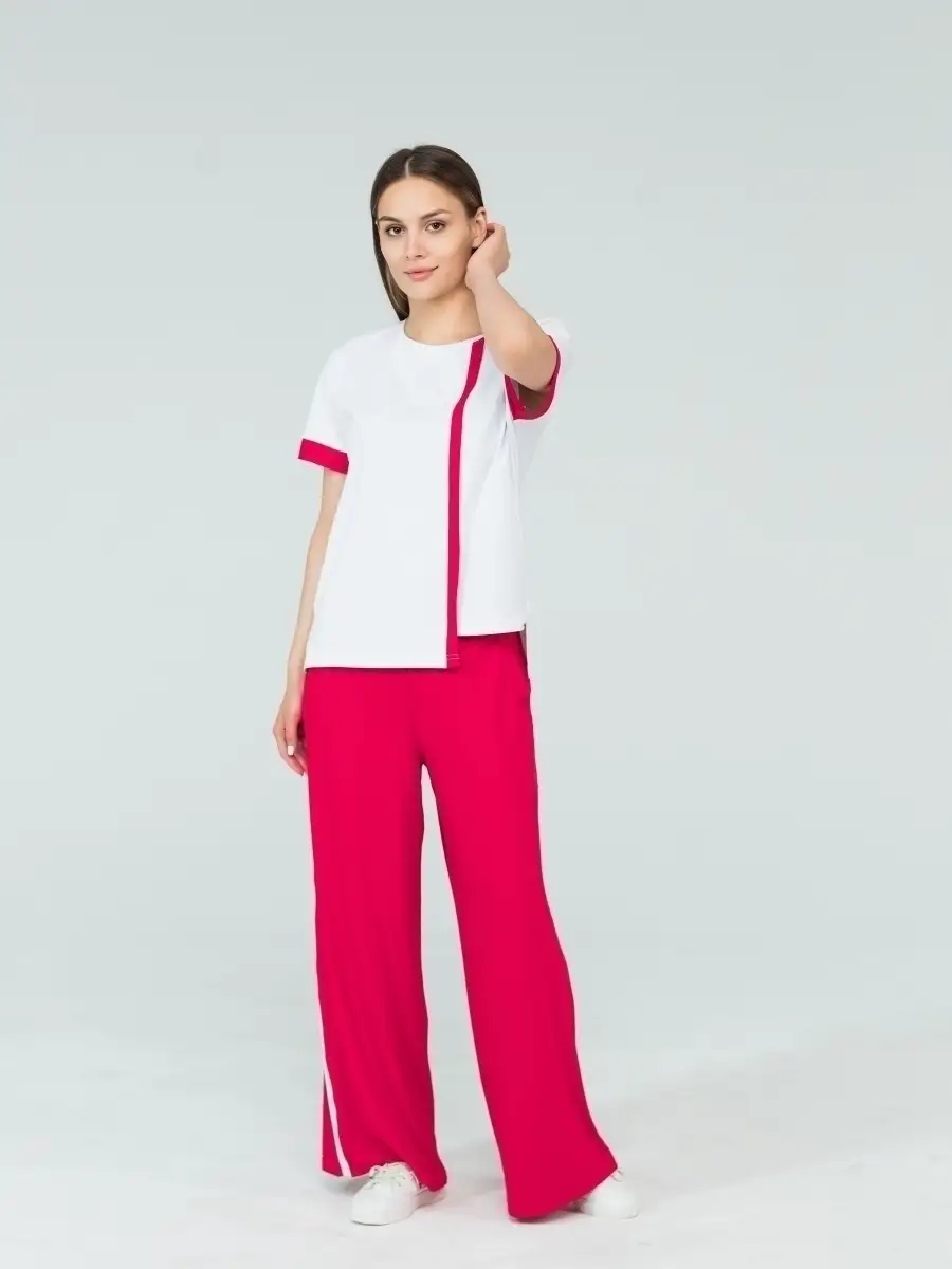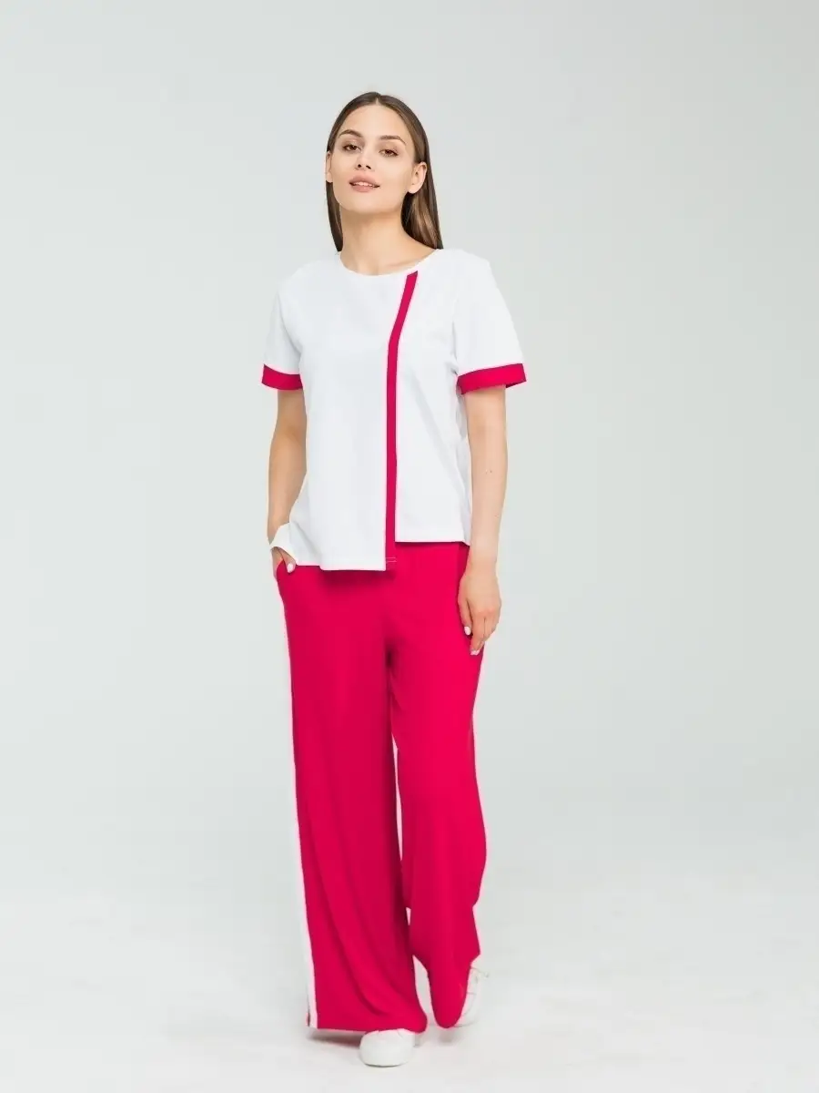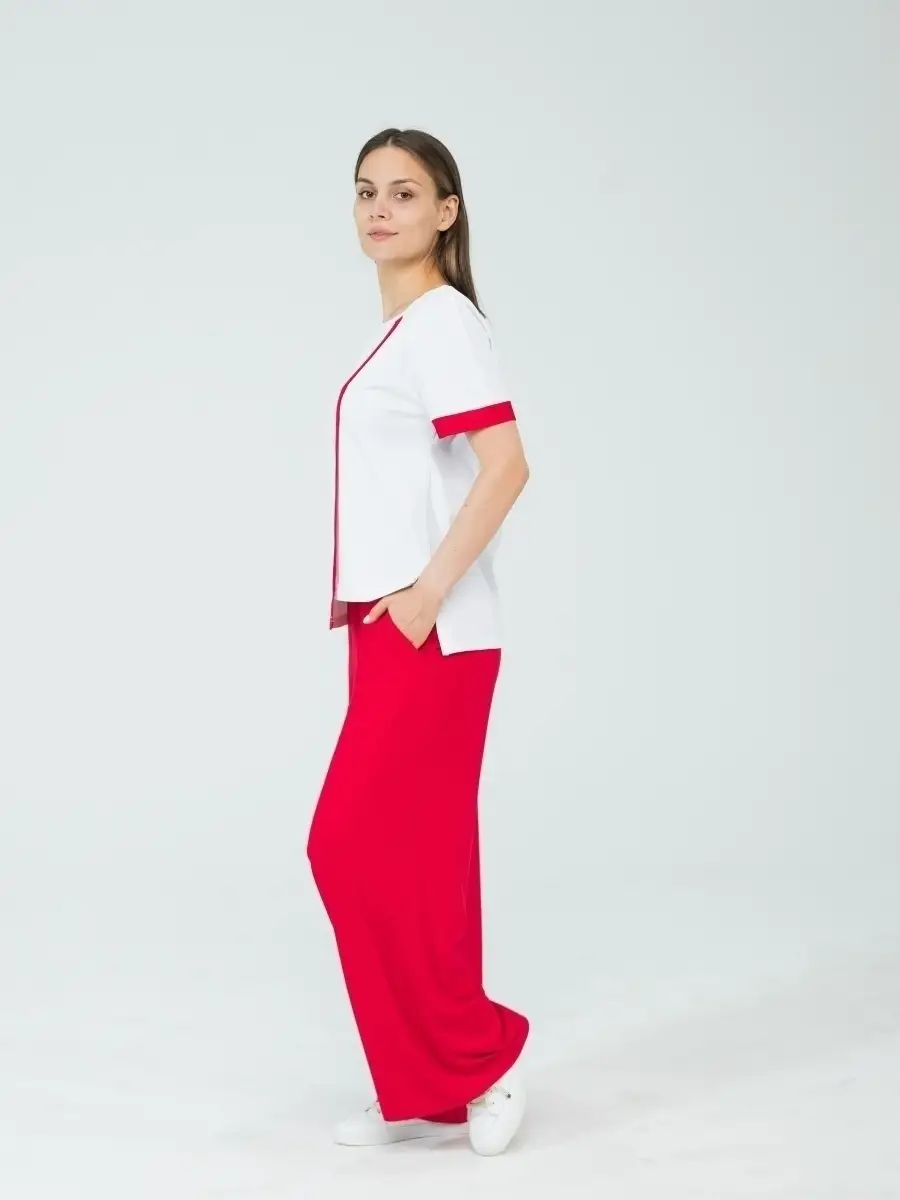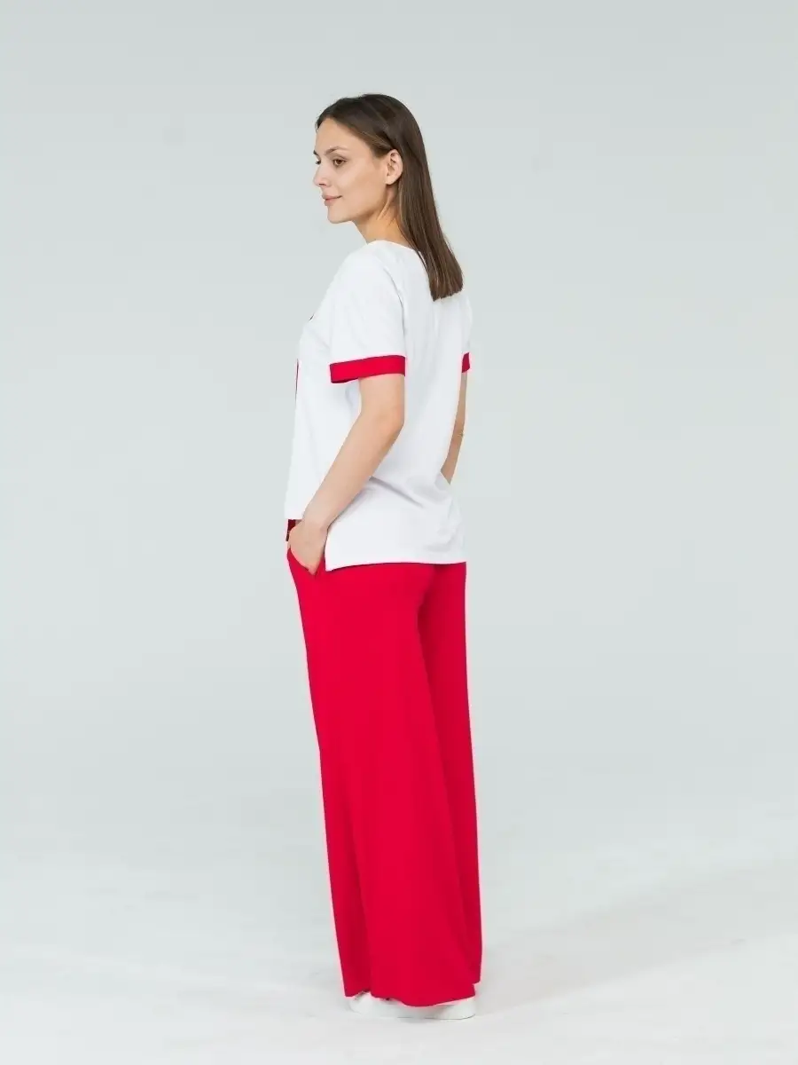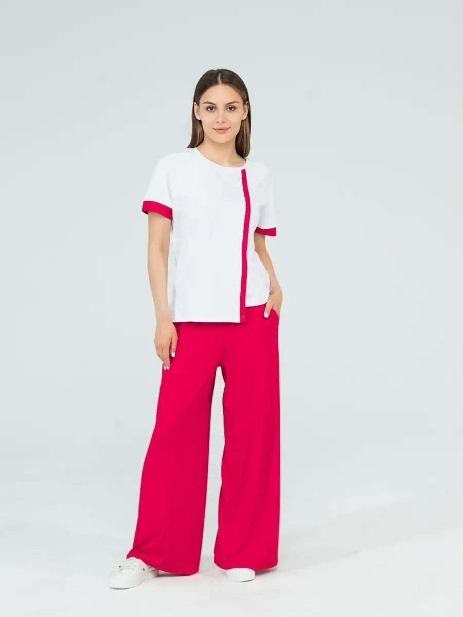Летний стильный женский костюм. Костюм женский с широкими брюками поможет вам быть в тренде этого сезона. В комплект входят широкие брюки палаццо с глубокими карманами, и удлиненная футболка с боковыми разрезами. Брюки палаццо подходят для любого типа фигуры, скрывают ее недостатки и подчеркивают достоинства. Костюм из мягкой футболки со спущенным рукавом и широкими брюками прекрасно подойдет под лаконичный офисный стиль, для вечерних и повседневных образов, для прогулок и занятий спортом, а также в качестве костюма для дома. Костюм пошит из хлопковой ткани, и в нем будет комфортно даже в сильную жару. Не теряет форму после многочисленных стирок. Универсальный и практичный женский костюм прекрасно подойдет девушке, женщине, подростку для повседневных и вечерних прогулок, путешествий, отдыха на море, занятий спортом. Брюки палаццо на поясе из широкой эластичной резинки не сковывают движений, прекрасно сидят на любой фигуре, очень комфортны в носке, подойдет и для беременных.