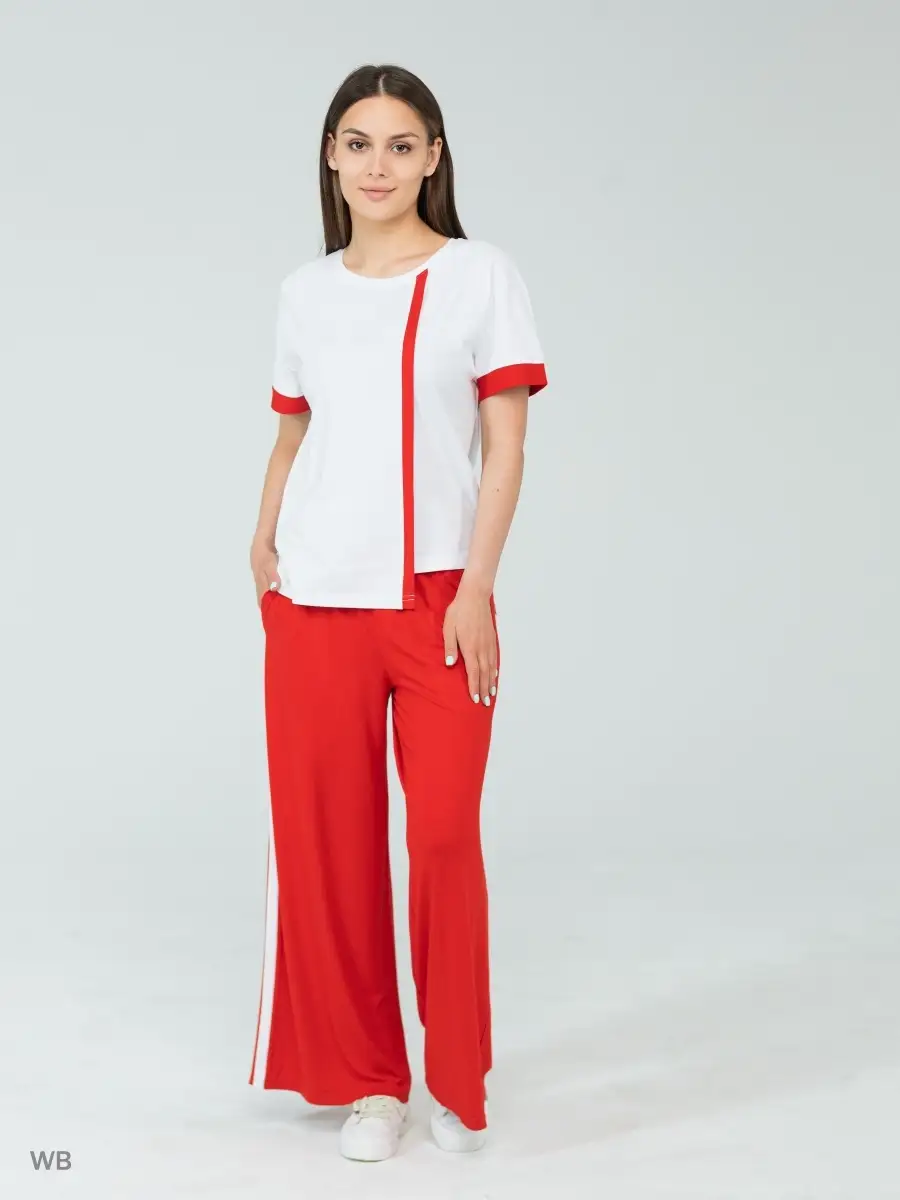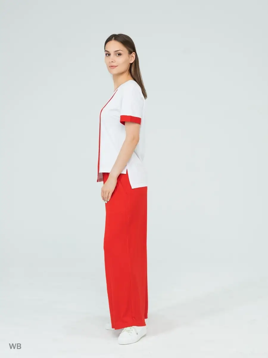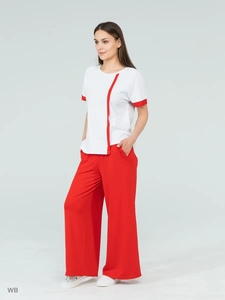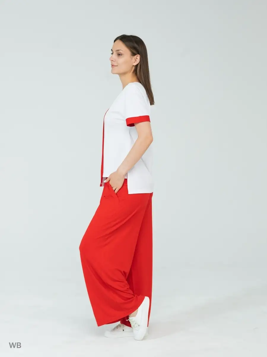 Летний стильный женский костюм. Костюм женский с широкими брюками поможет вам быть в тренде этого сезона. В комплект входят широкие брюки палаццо с глубокими карманами, и удлиненная футболка с боковыми разрезами. Брюки палаццо подходят для любого типа фигуры, скрывают ее недостатки и подчеркивают достоинства. Костюм из мягкой футболки со спущенным рукавом и широкими брюками прекрасно подойдет под лаконичный офисный стиль, для вечерних и повседневных образов, для прогулок и занятий спортом, а также в качестве костюма для дома. Костюм пошит из хлопковой ткани, и в нем будет комфортно даже в сильную жару. Не теряет форму после многочисленных стирок. Универсальный и практичный женский костюм прекрасно подойдет девушке, женщине, подростку для повседневных и вечерних прогулок, путешествий, отдыха на море, занятий спортом. Брюки палаццо на поясе из широкой эластичной резинки не сковывают движений, прекрасно сидят на любой фигуре, очень комфортны в носке, подойдет и для беременных.