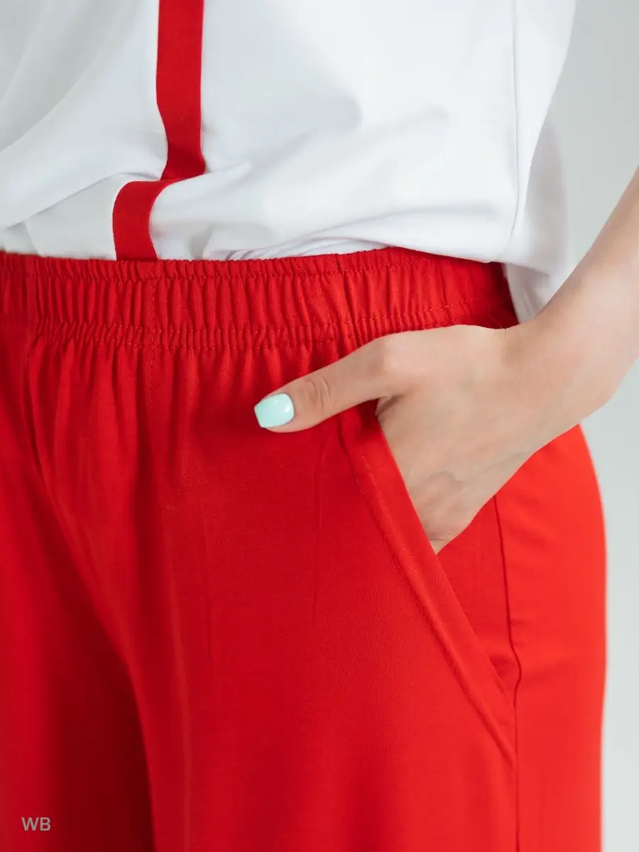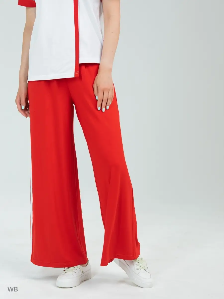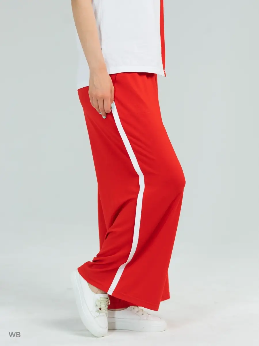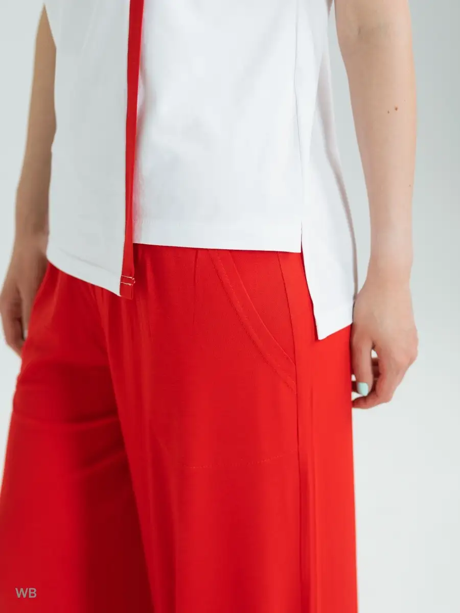 Летний стильный женский костюм. Костюм женский с широкими брюками поможет вам быть в тренде этого сезона. В комплект входят широкие брюки палаццо с глубокими карманами, и удлиненная футболка с боковыми разрезами. Брюки палаццо подходят для любого типа фигуры, скрывают ее недостатки и подчеркивают достоинства. Костюм из мягкой футболки со спущенным рукавом и широкими брюками прекрасно подойдет под лаконичный офисный стиль, для вечерних и повседневных образов, для прогулок и занятий спортом, а также в качестве костюма для дома. Костюм пошит из хлопковой ткани, и в нем будет комфортно даже в сильную жару. Не теряет форму после многочисленных стирок. Универсальный и практичный женский костюм прекрасно подойдет девушке, женщине, подростку для повседневных и вечерних прогулок, путешествий, отдыха на море, занятий спортом. Брюки палаццо на поясе из широкой эластичной резинки не сковывают движений, прекрасно сидят на любой фигуре, очень комфортны в носке, подойдет и для беременных.