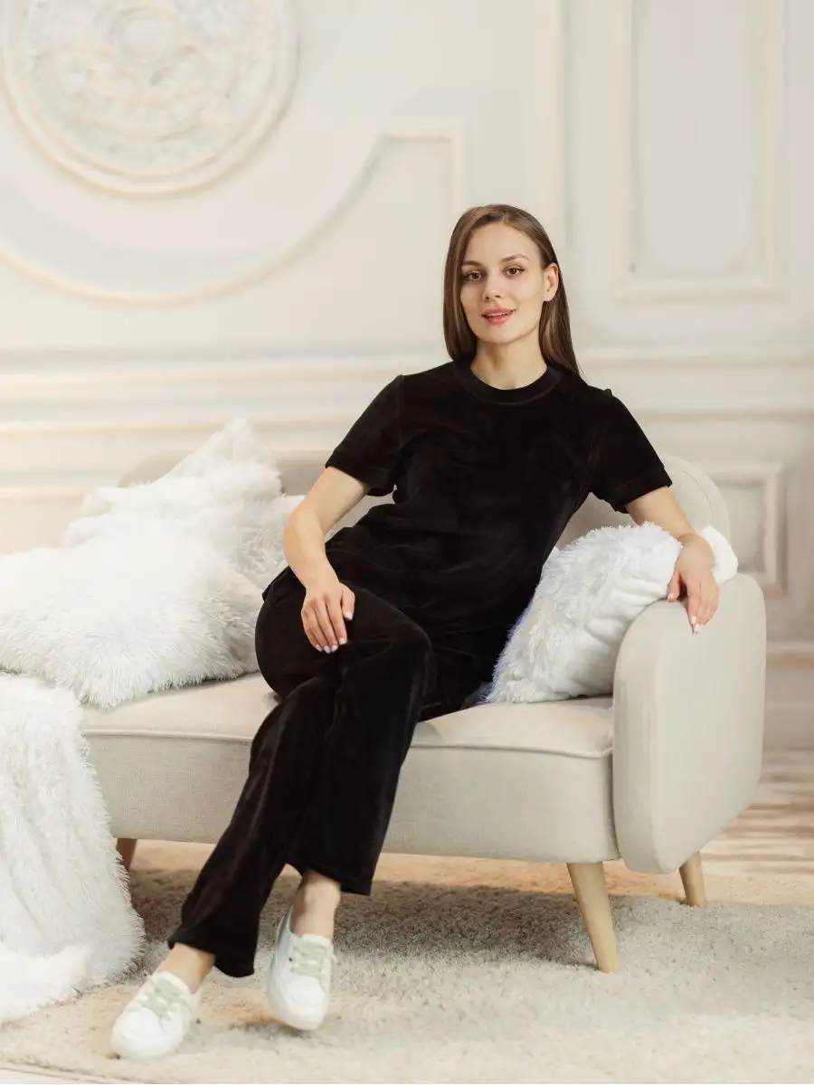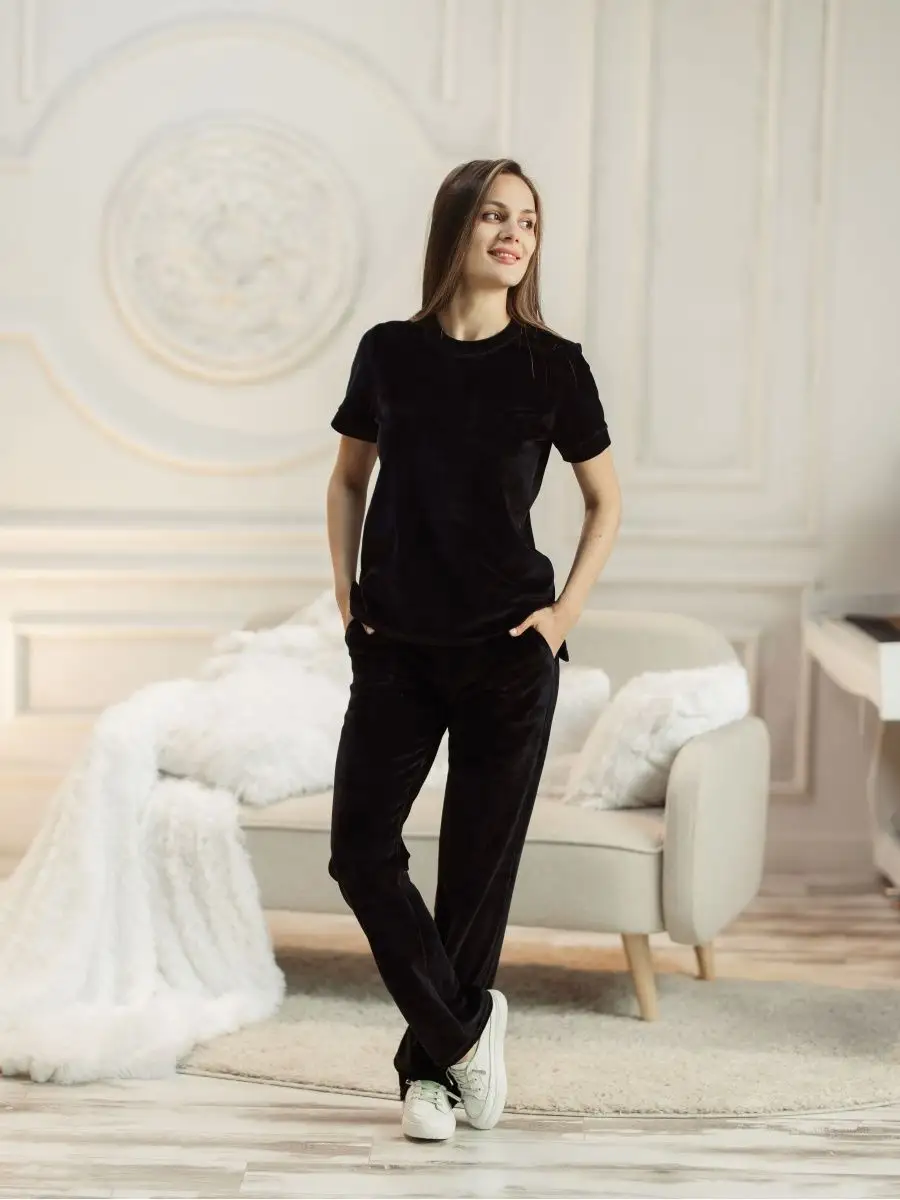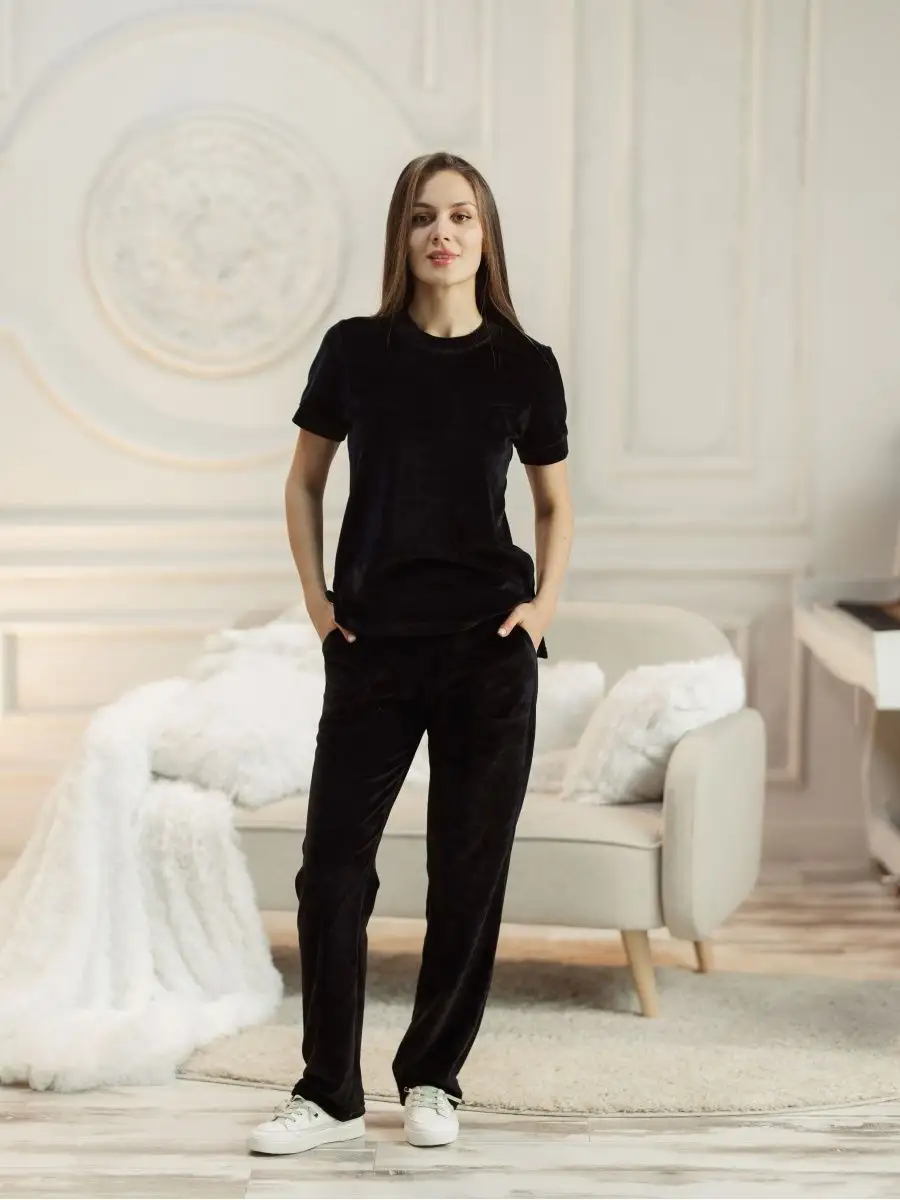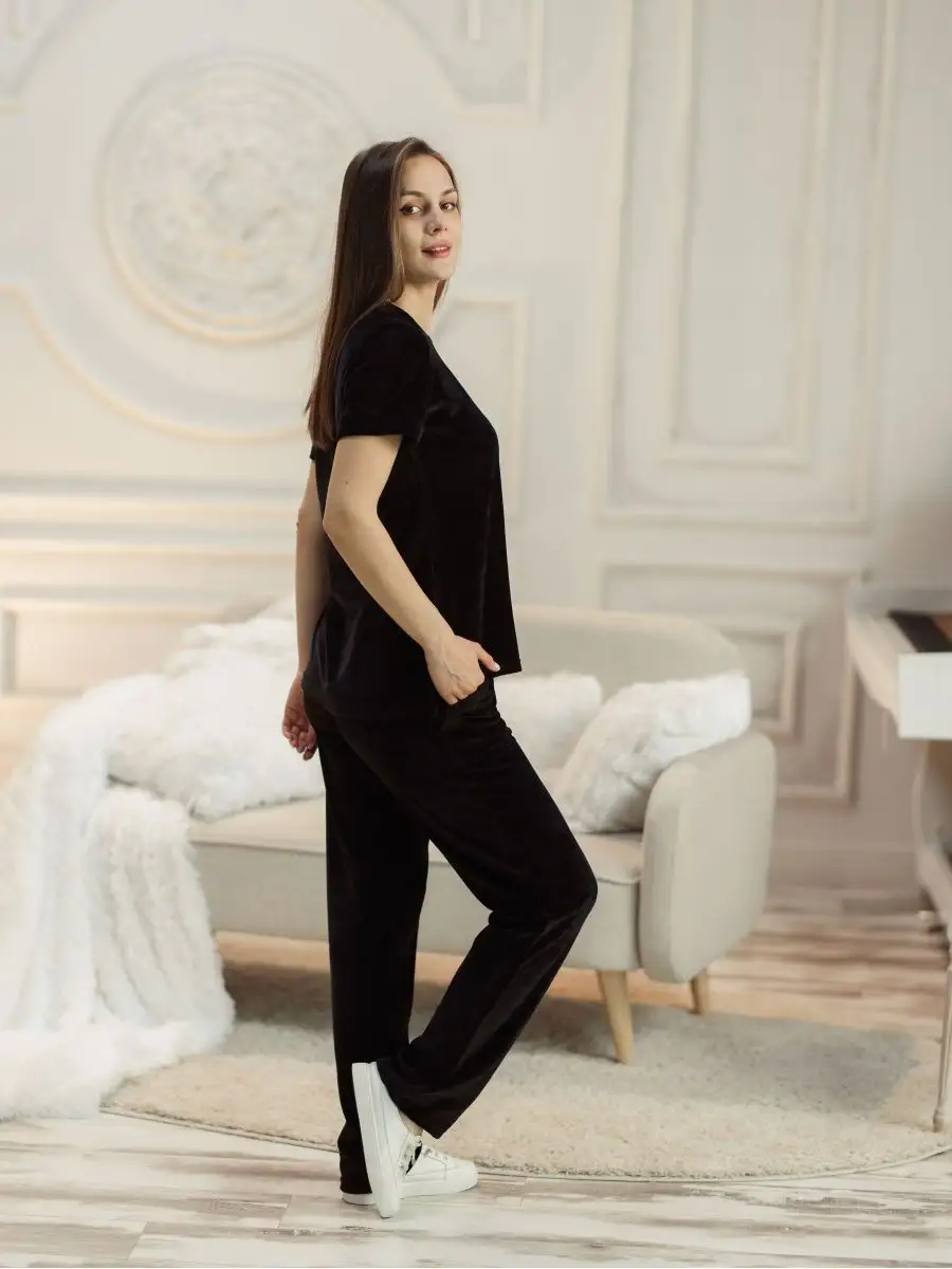 Женский комфортный спортивный костюм велюровый для женщин всех возрастов. Удлиненная кофта и прямые штаны с карманами без манжета. Пошит костюм из качественного хлопкового велюра. Преимущества велюра из натурального хлопка: сохраняют тепло, тело в нем свободно дышит, мягкий и приятный к телу и наощупь. Не теряет форму после многочисленных стирок. Универсальный и практичный женский велюровый костюм подойдет для занятий спортом, прогулок, путешествий, на тренажеры и фитнес, как домашний костюм женский. Футболка и свободные брюки с карманами, эластичной резинкой на поясе не сковывают движений, прекрасно сидят на любой фигуре. В нем вам будет уютно и комфортно. Брючный костюм женский представлен в больших размерах и подойдет для беременных. Также в нем можно выполнять повседневные дела.