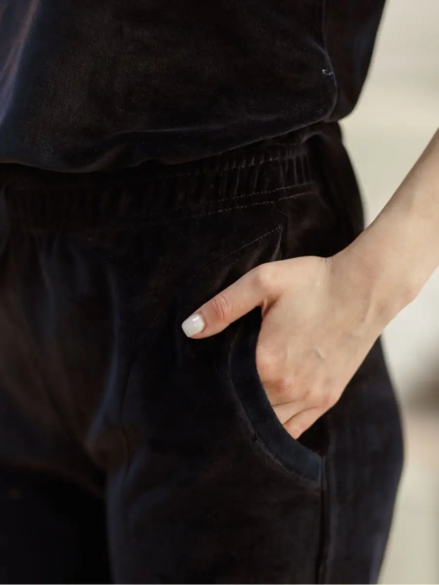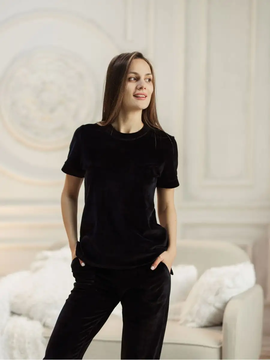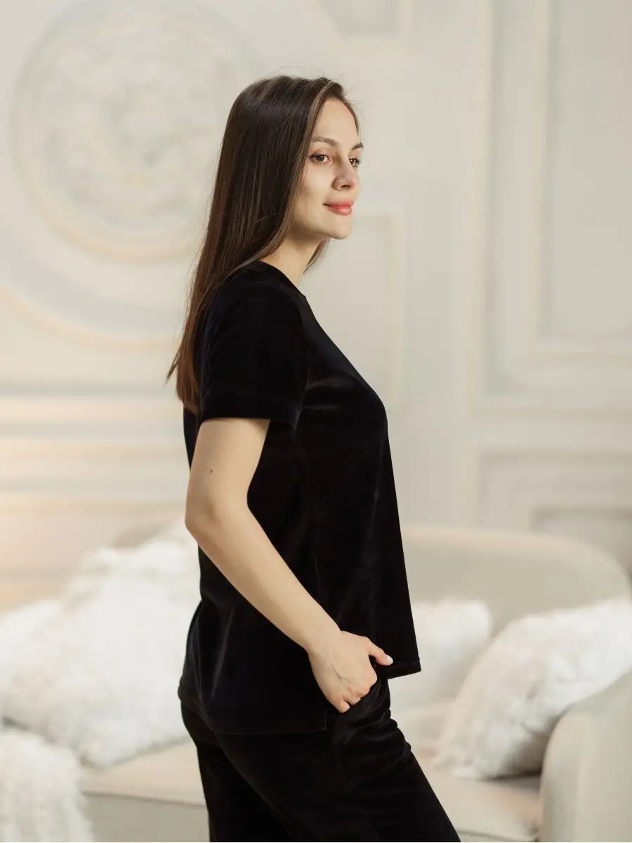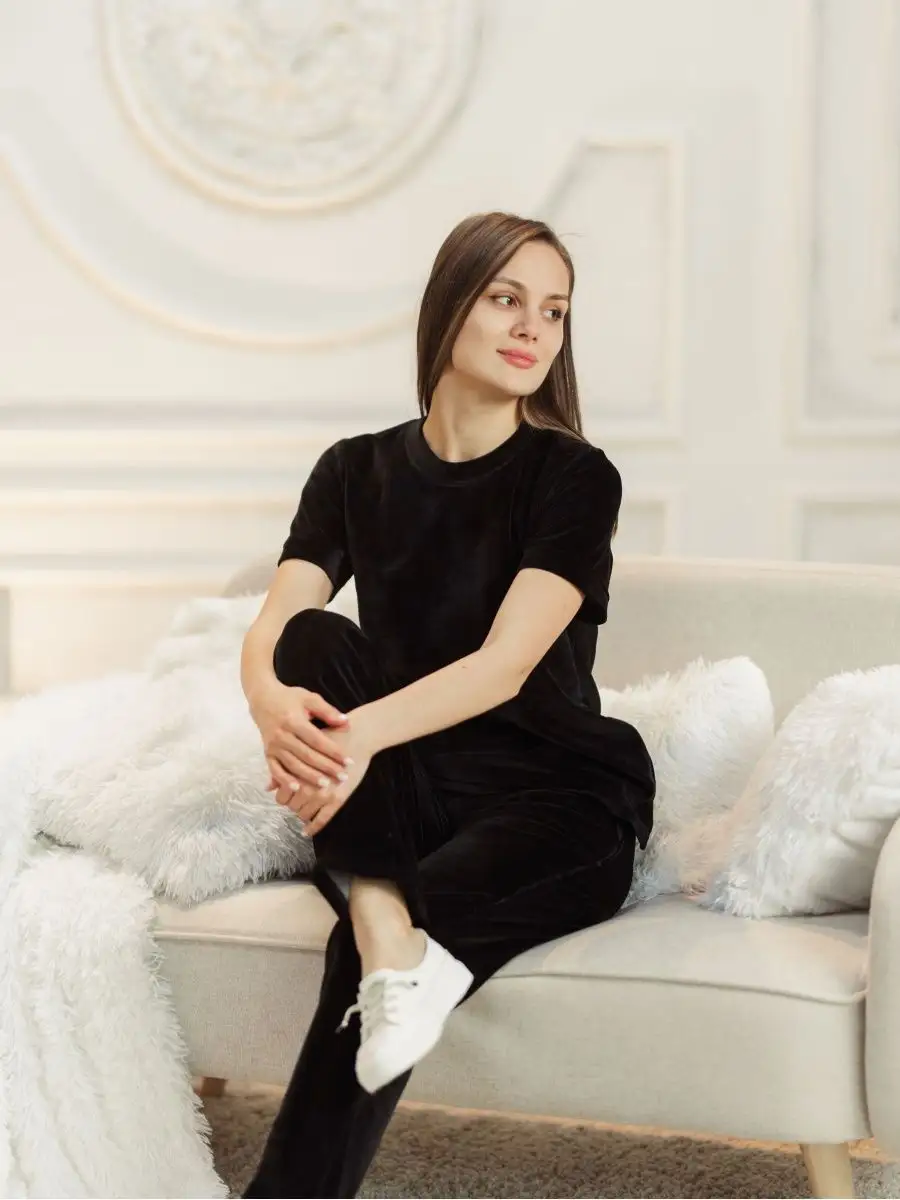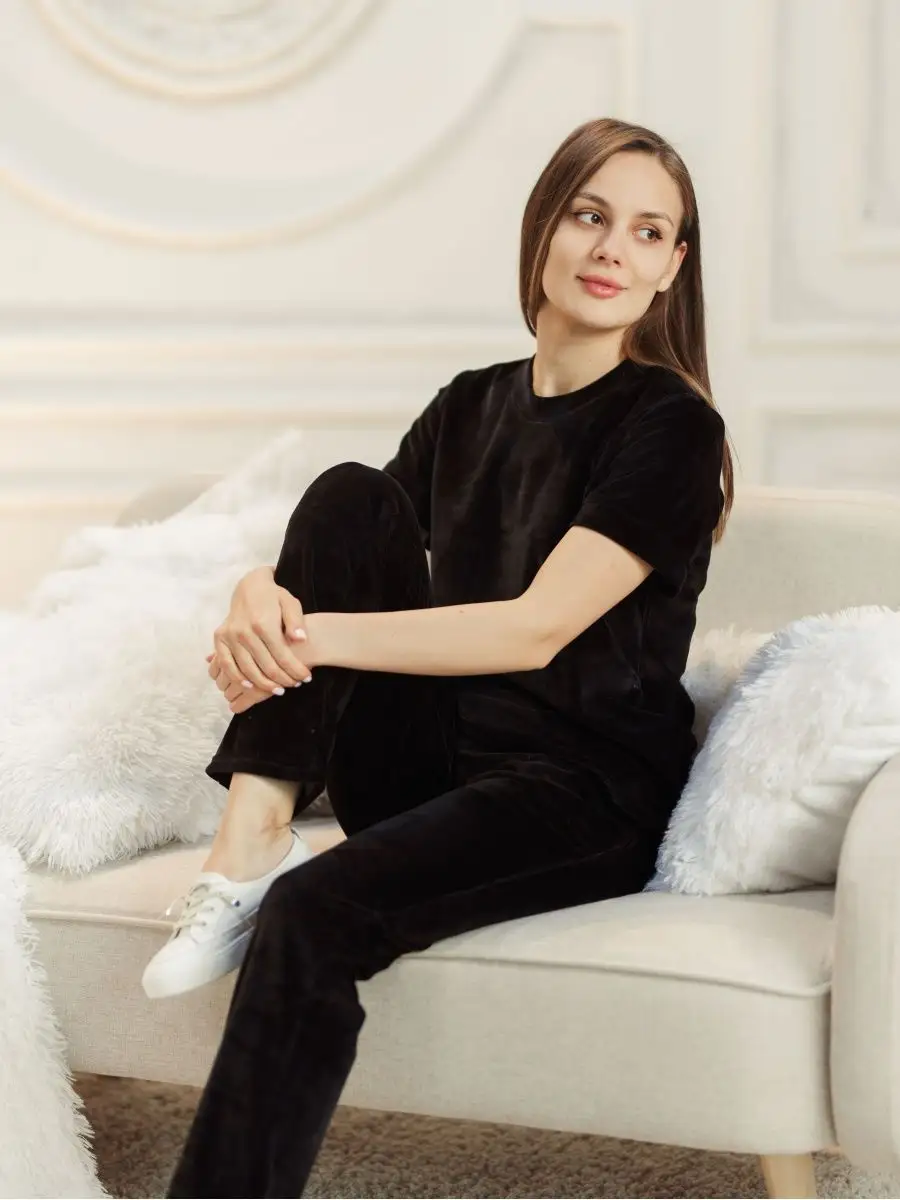 Женский комфортный спортивный костюм велюровый для женщин всех возрастов. Удлиненная кофта и прямые штаны с карманами без манжета. Пошит костюм из качественного хлопкового велюра. Преимущества велюра из натурального хлопка: сохраняют тепло, тело в нем свободно дышит, мягкий и приятный к телу и наощупь. Не теряет форму после многочисленных стирок. Универсальный и практичный женский велюровый костюм подойдет для занятий спортом, прогулок, путешествий, на тренажеры и фитнес, как домашний костюм женский. Футболка и свободные брюки с карманами, эластичной резинкой на поясе не сковывают движений, прекрасно сидят на любой фигуре. В нем вам будет уютно и комфортно. Брючный костюм женский представлен в больших размерах и подойдет для беременных. Также в нем можно выполнять повседневные дела.