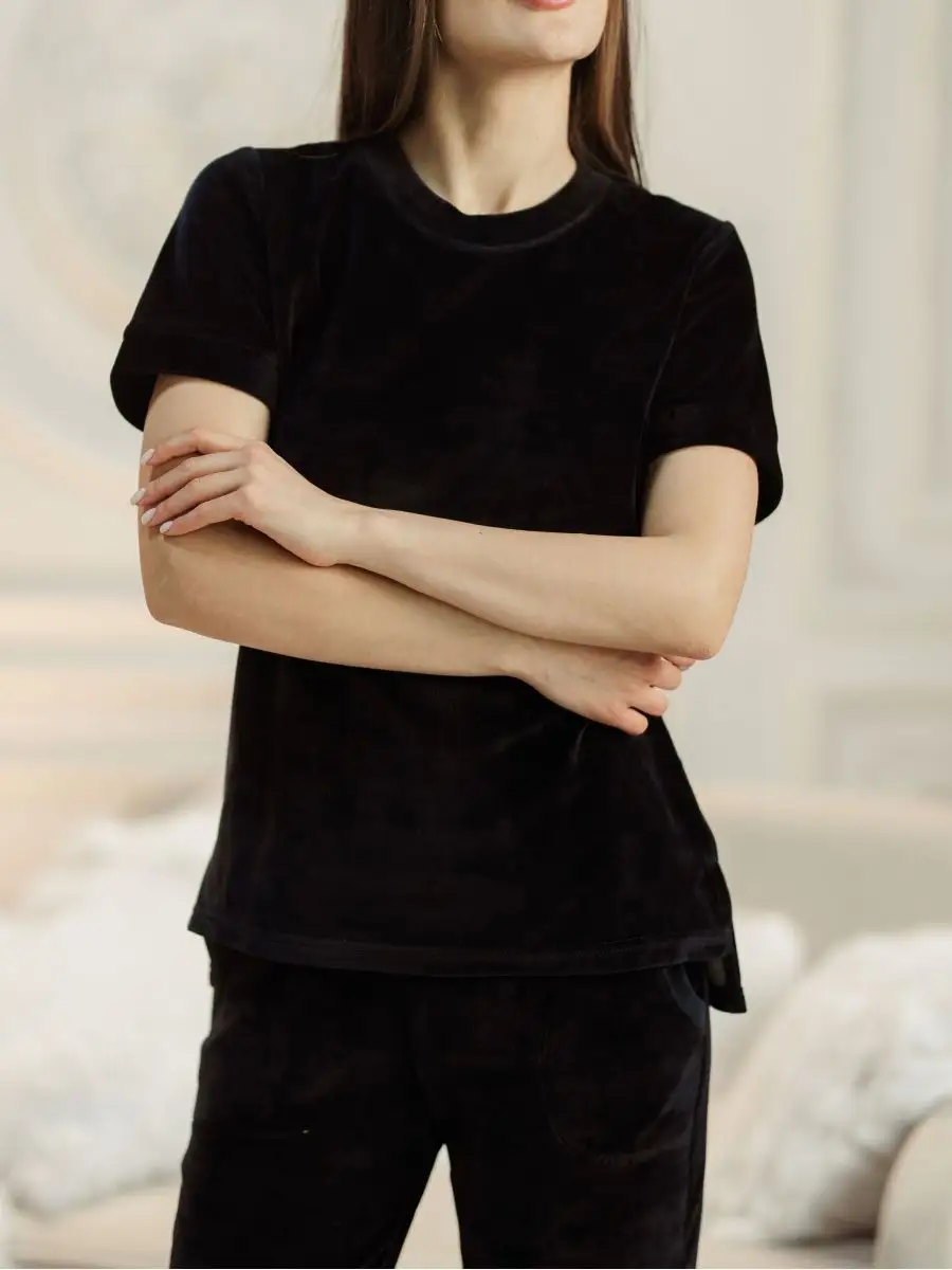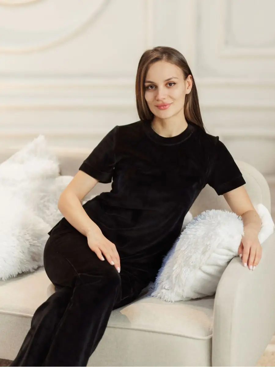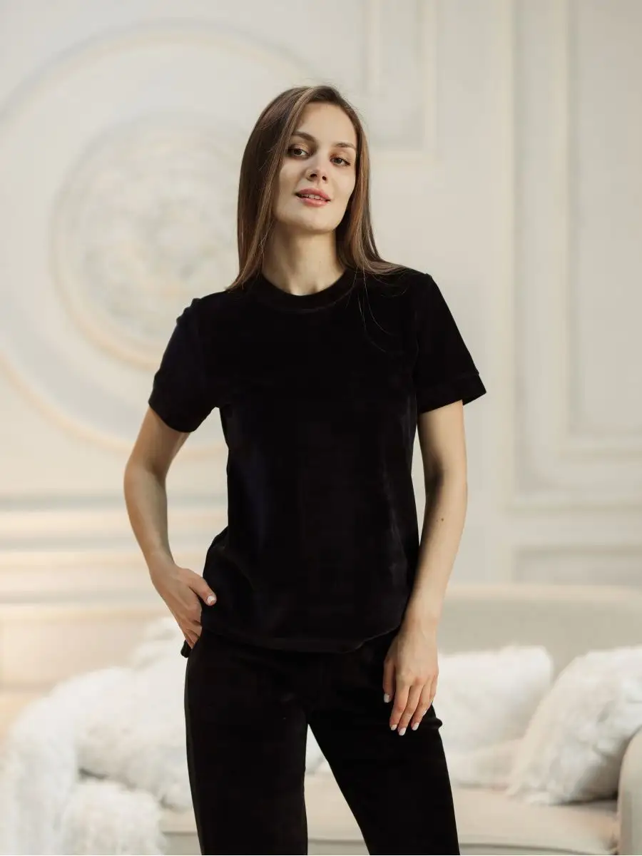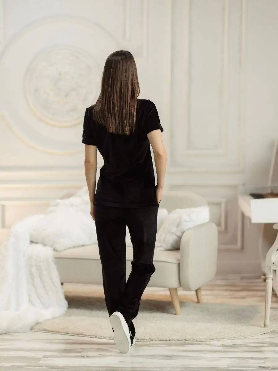Женский комфортный спортивный костюм велюровый для женщин всех возрастов. Удлиненная кофта и прямые штаны с карманами без манжета. Пошит костюм из качественного хлопкового велюра. Преимущества велюра из натурального хлопка: сохраняют тепло, тело в нем свободно дышит, мягкий и приятный к телу и наощупь. Не теряет форму после многочисленных стирок. Универсальный и практичный женский велюровый костюм подойдет для занятий спортом, прогулок, путешествий, на тренажеры и фитнес, как домашний костюм женский. Футболка и свободные брюки с карманами, эластичной резинкой на поясе не сковывают движений, прекрасно сидят на любой фигуре. В нем вам будет уютно и комфортно. Брючный костюм женский представлен в больших размерах и подойдет для беременных. Также в нем можно выполнять повседневные дела.