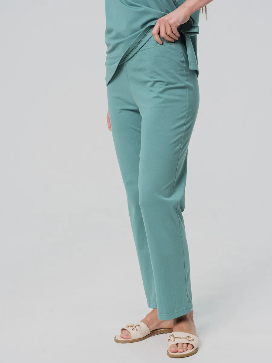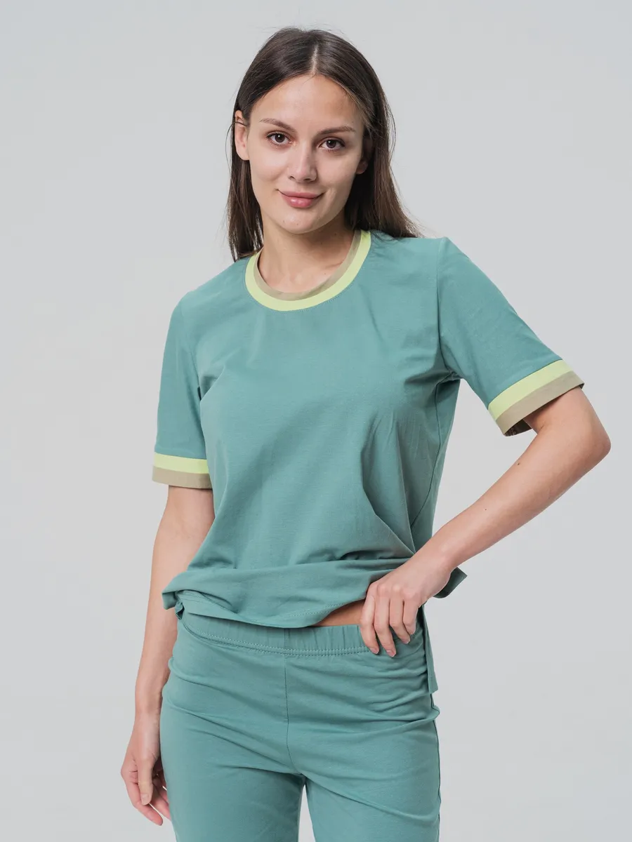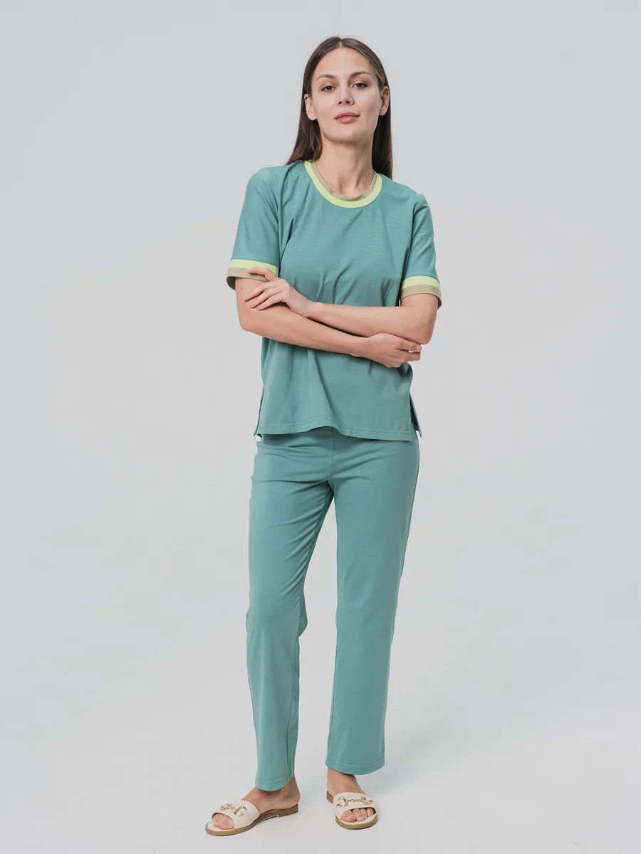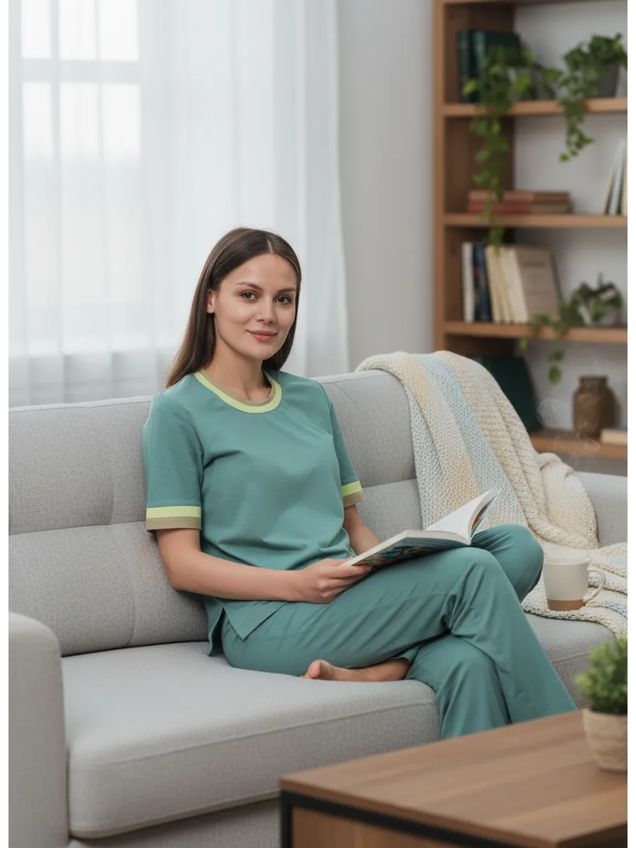 Пижама с брюками - это идеальный выбор для комфортного сна и отдыха. Сшита из мягкого и дышащего трикотажа из хлопка , она подарит вам ощущение нежности и легкости на коже. Комплект брючный можно носить и как домашняя одежда и для сна подойдет. Домашний костюм пригодится и на отдыхе, на даче. Трикотажная домашняя пижама идеально подходит для сна, повседневной носки или как домашняя одежда. Модель с короткими рукавами и брюками подойдет для женщин среднего и невысокого роста, а отсутствие карманов обеспечит дополнительный комфорт. Пижама со штанами подойдет как для повседневной носки, так и для пребывания в роддоме.