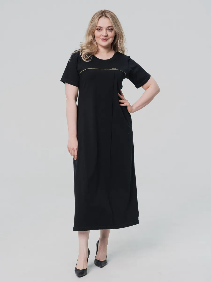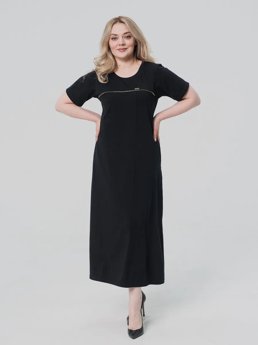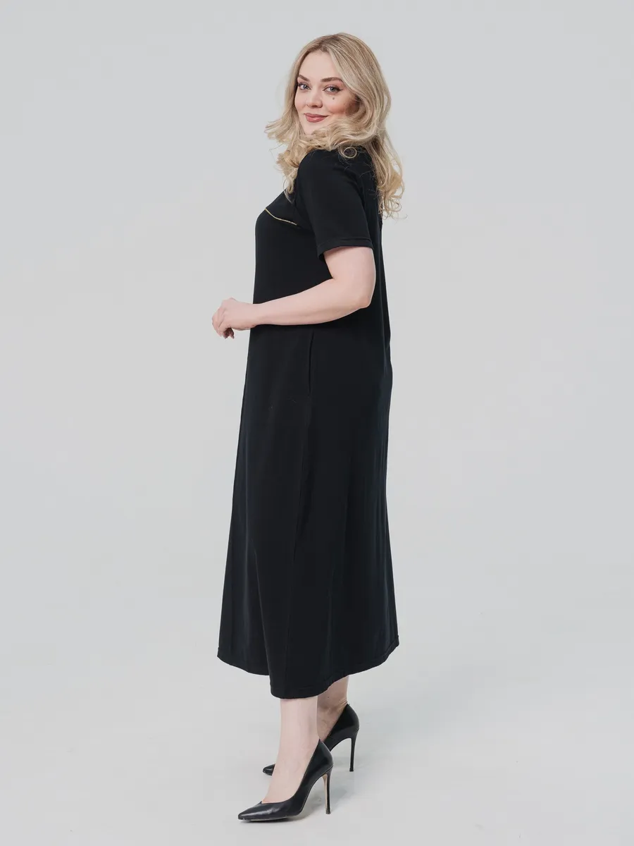 Элегантное длинное платье выполнено из легкого хлопка, что обеспечивает комфорт в летнюю погоду. Модель имеет свободный крой и короткие рукава, что делает его идеальным вариантом для повседневной носки. Однотонный черный цвет подчеркивает универсальность платья, позволяя сочетать его с различными аксессуарами и обувью.