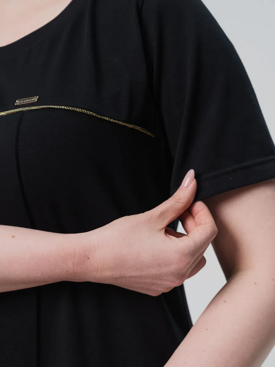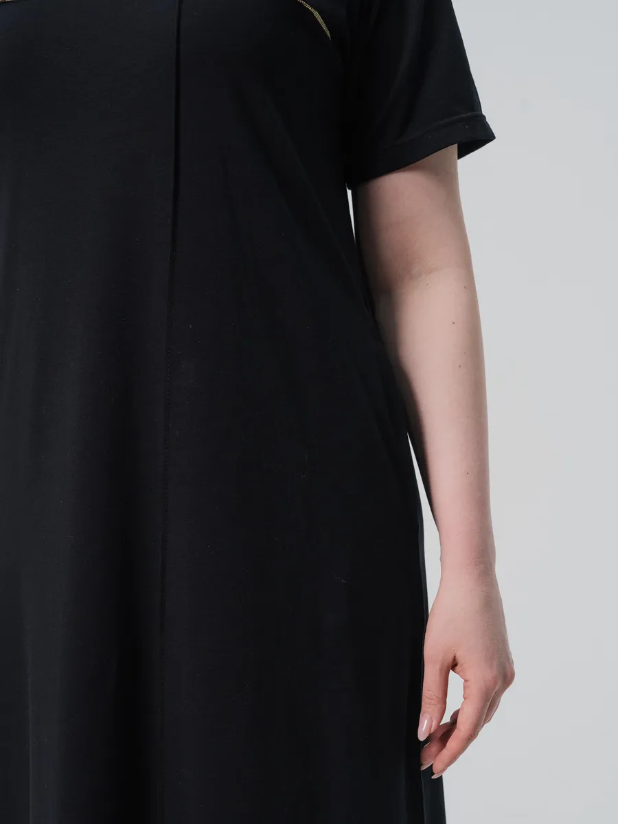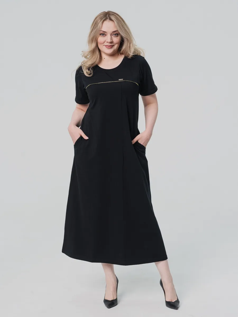 Элегантное длинное платье выполнено из легкого хлопка, что обеспечивает комфорт в летнюю погоду. Модель имеет свободный крой и короткие рукава, что делает его идеальным вариантом для повседневной носки. Однотонный черный цвет подчеркивает универсальность платья, позволяя сочетать его с различными аксессуарами и обувью.