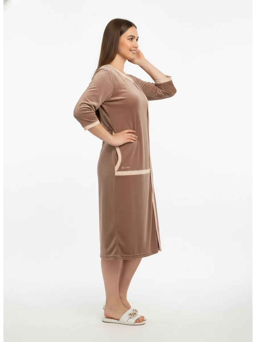 Теплый и стильный халат для домашнего комфорта — мягкий велюр идеально подходит для создания уютной атмосферы в осенний и зимний день. Этот домашний халат с рукавом и карманами станет незаменимой вещью для женщин, ценящих премиум качество и внимание к деталям. Халат сшит из велюра высшего сорта производства Турция, с высоким содержанием хлопка, стойкий к износу, не линяет. Изделие из турецкого велюра отличается высоким уровнем комфорта и прочности, благодаря собственному производству и тщательному контролю качества.