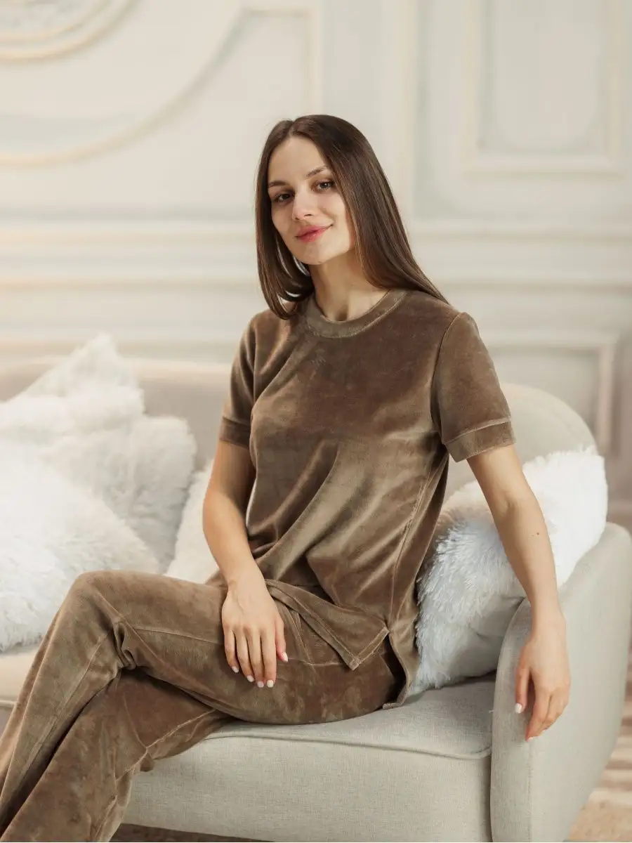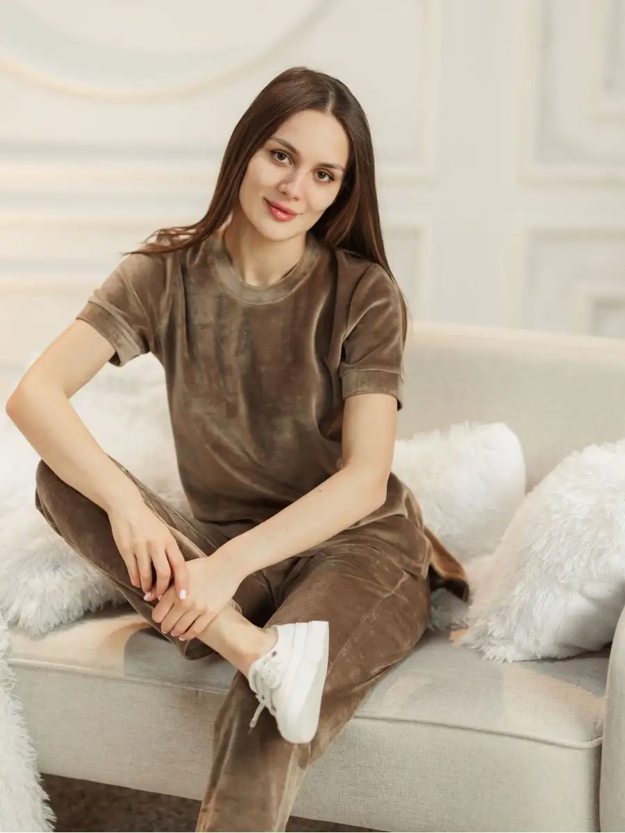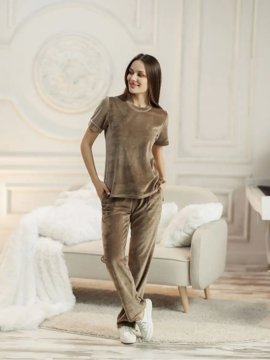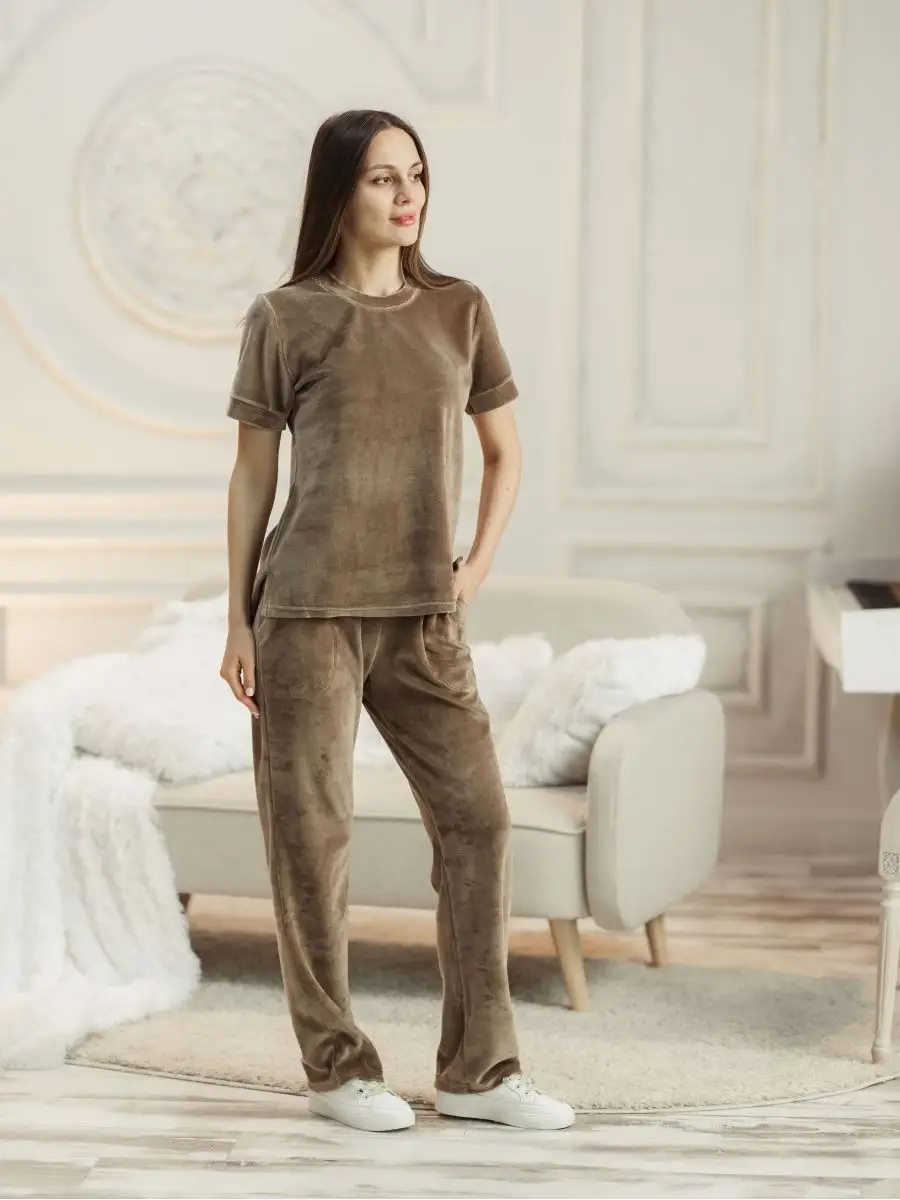Женский комфортный спортивный костюм велюровый для женщин всех возрастов. Удлиненная кофта и прямые штаны с карманами без манжета. Пошит костюм из качественного хлопкового велюра. Преимущества велюра из натурального хлопка: сохраняют тепло, тело в нем свободно дышит, мягкий и приятный к телу и наощупь. Не теряет форму после многочисленных стирок. Универсальный и практичный женский велюровый костюм подойдет для занятий спортом, прогулок, путешествий, на тренажеры и фитнес, как домашний костюм женский. Футболка и свободные брюки с карманами, эластичной резинкой на поясе не сковывают движений, прекрасно сидят на любой фигуре. В нем вам будет уютно и комфортно. Брючный костюм женский представлен в больших размерах и подойдет для беременных. Также в нем можно выполнять повседневные дела.