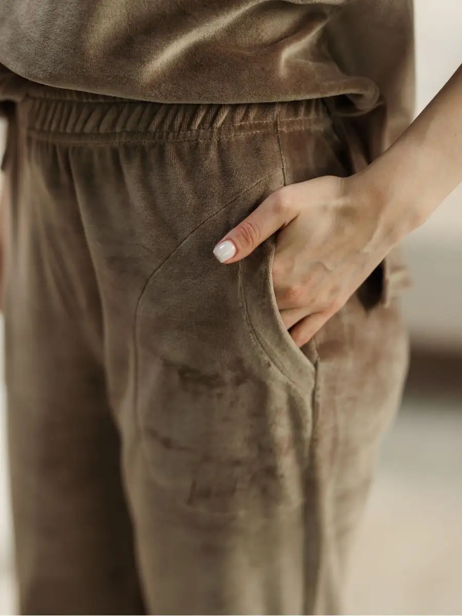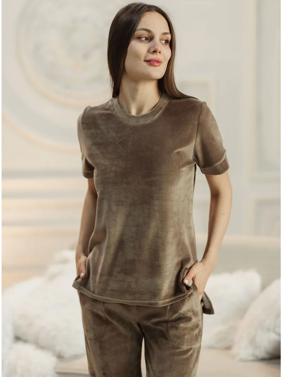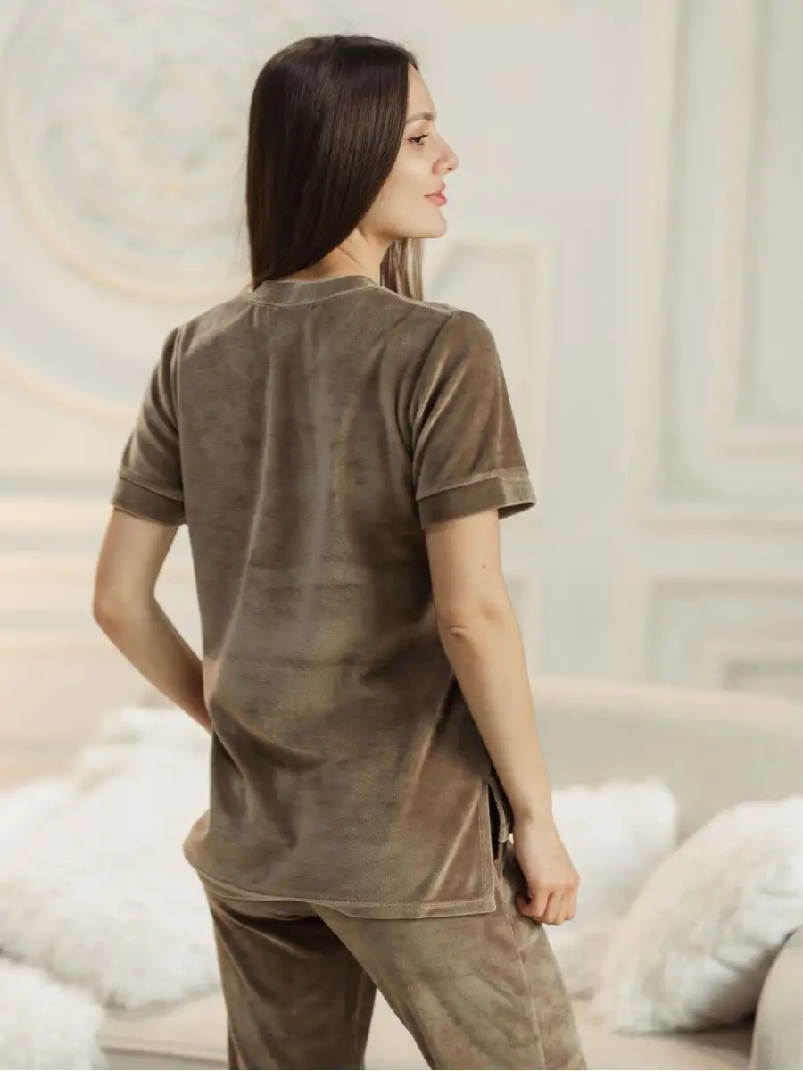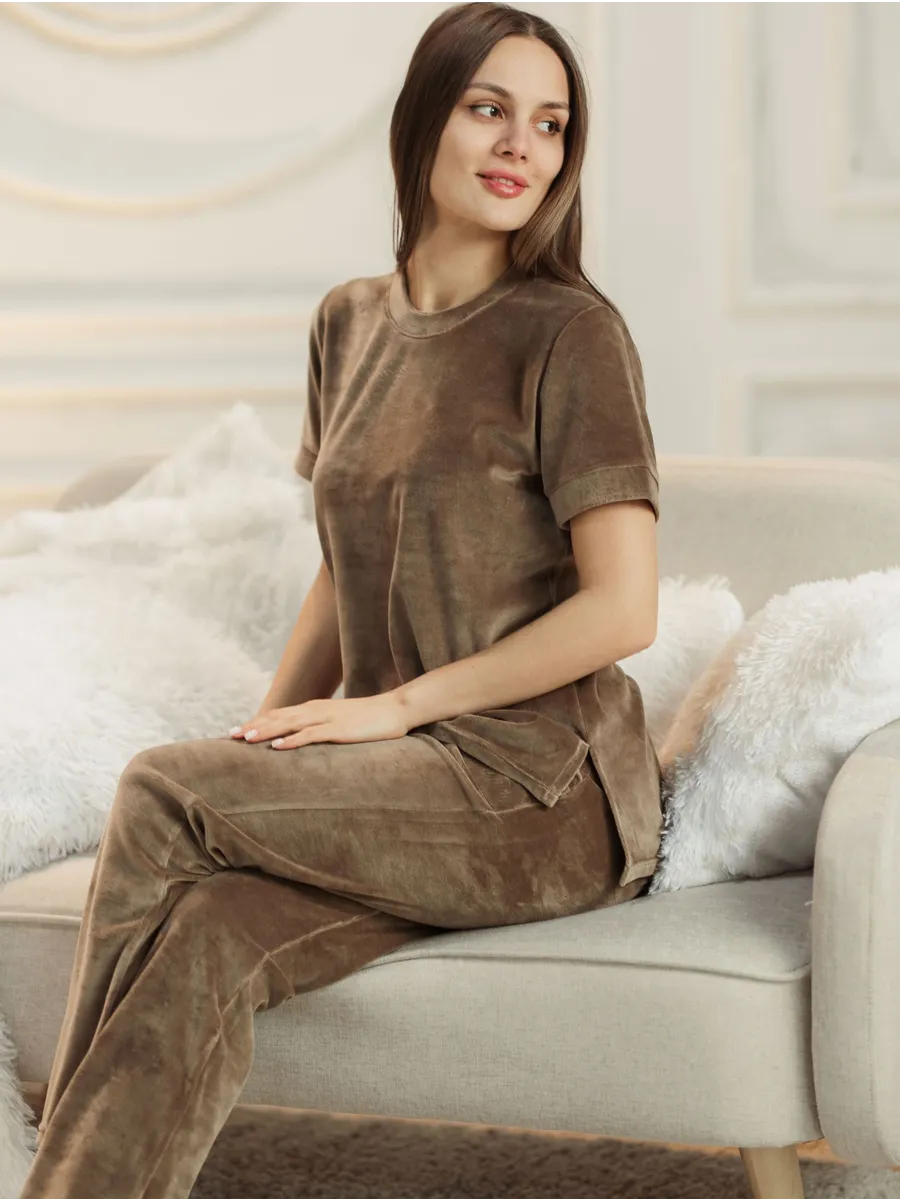 Женский комфортный спортивный костюм велюровый для женщин всех возрастов. Удлиненная кофта и прямые штаны с карманами без манжета. Пошит костюм из качественного хлопкового велюра. Преимущества велюра из натурального хлопка: сохраняют тепло, тело в нем свободно дышит, мягкий и приятный к телу и наощупь. Не теряет форму после многочисленных стирок. Универсальный и практичный женский велюровый костюм подойдет для занятий спортом, прогулок, путешествий, на тренажеры и фитнес, как домашний костюм женский. Футболка и свободные брюки с карманами, эластичной резинкой на поясе не сковывают движений, прекрасно сидят на любой фигуре. В нем вам будет уютно и комфортно. Брючный костюм женский представлен в больших размерах и подойдет для беременных. Также в нем можно выполнять повседневные дела.